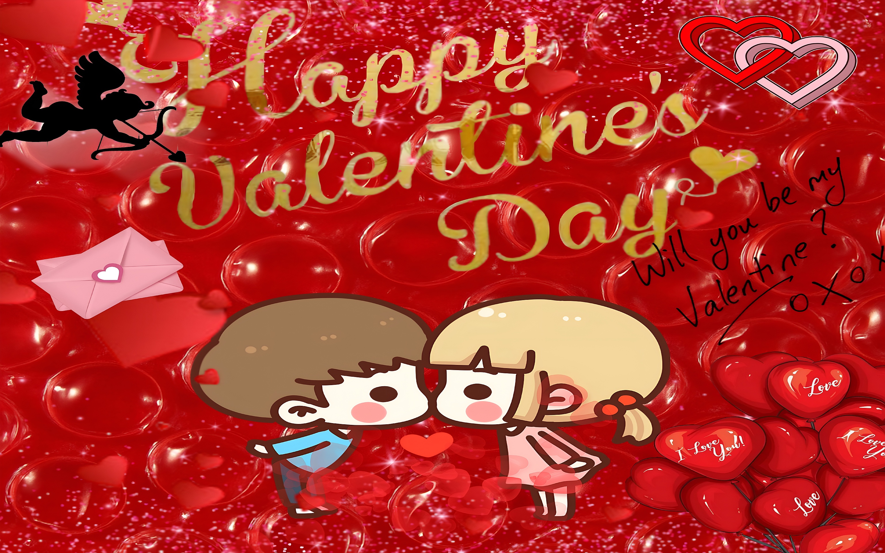 This wallpaper stands out with its cute cartoon couple, rendered in a simple yet expressive style that appeals to all ages. The boy and girl, depicted with rosy cheeks and soft outlines, evoke a sense of innocence and pure love. The background’s glossy red bubbles add depth and texture, while the floating heart balloons inscribed with loving messages like "I Love You" enhance the romantic vibe. The cupid silhouette adds a classic Valentine’s touch, symbolizing love’s playful and magical nature. This design is perfect for those seeking a romantic HD background that combines fun, warmth, and festive charm.