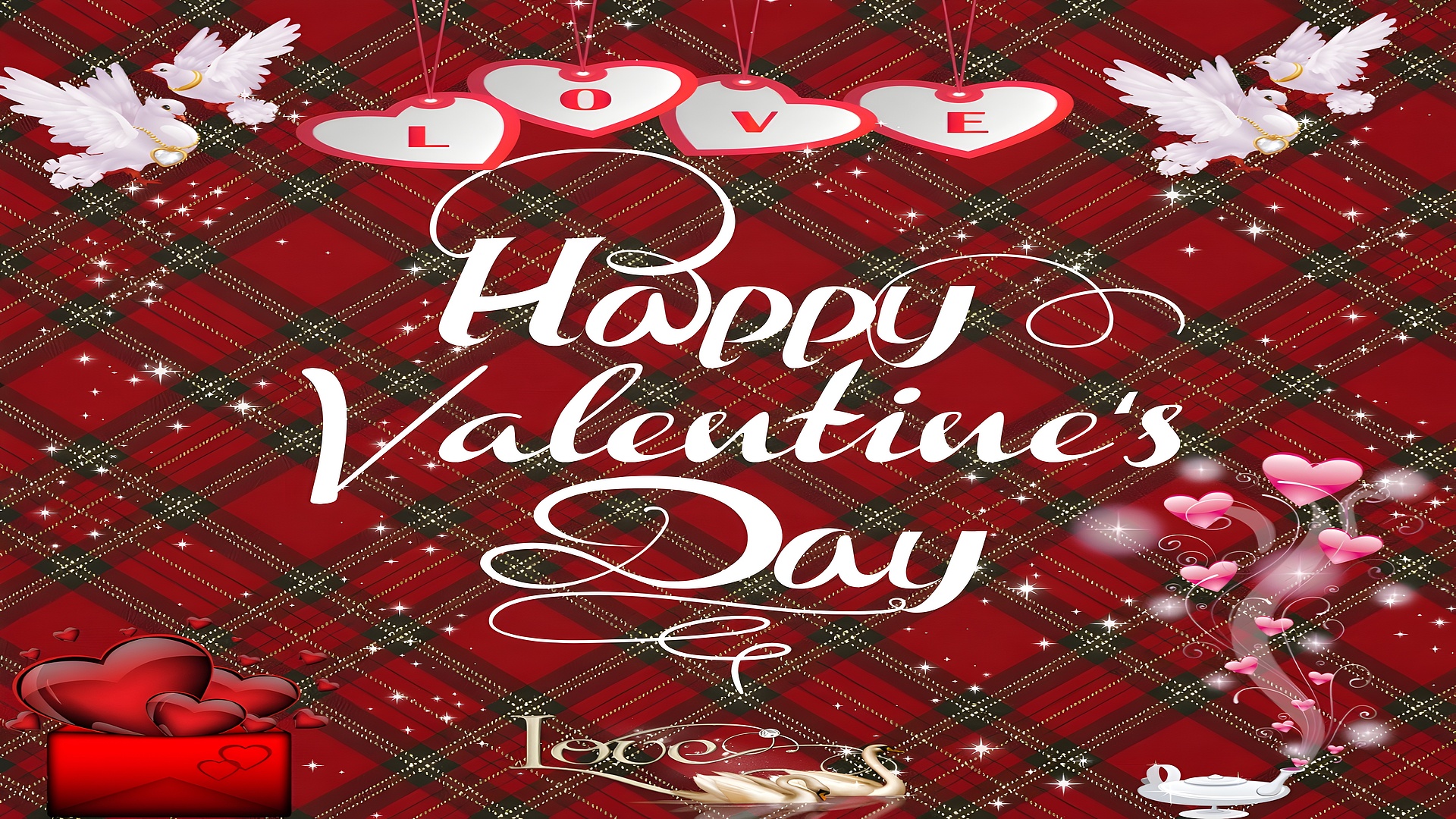 The wallpaper’s artistic style blends classic romantic symbolism with modern decorative elements. The dominant deep red plaid background sets a cozy and passionate mood, while the white doves symbolize peace and fidelity, enhancing the romantic theme. The hanging heart tags with the word "LOVE" and the swirling heart-shaped smoke add dynamic movement and whimsy to the design. The golden swan couple at the bottom symbolizes enduring love and partnership, complementing the overall theme. These elements, combined with sparkling star effects and elegant calligraphy, create a festive and heartwarming atmosphere that resonates with the spirit of Valentine's Day. This romantic wallpaper is ideal for those seeking a blend of tradition and contemporary design in their love-themed digital art.