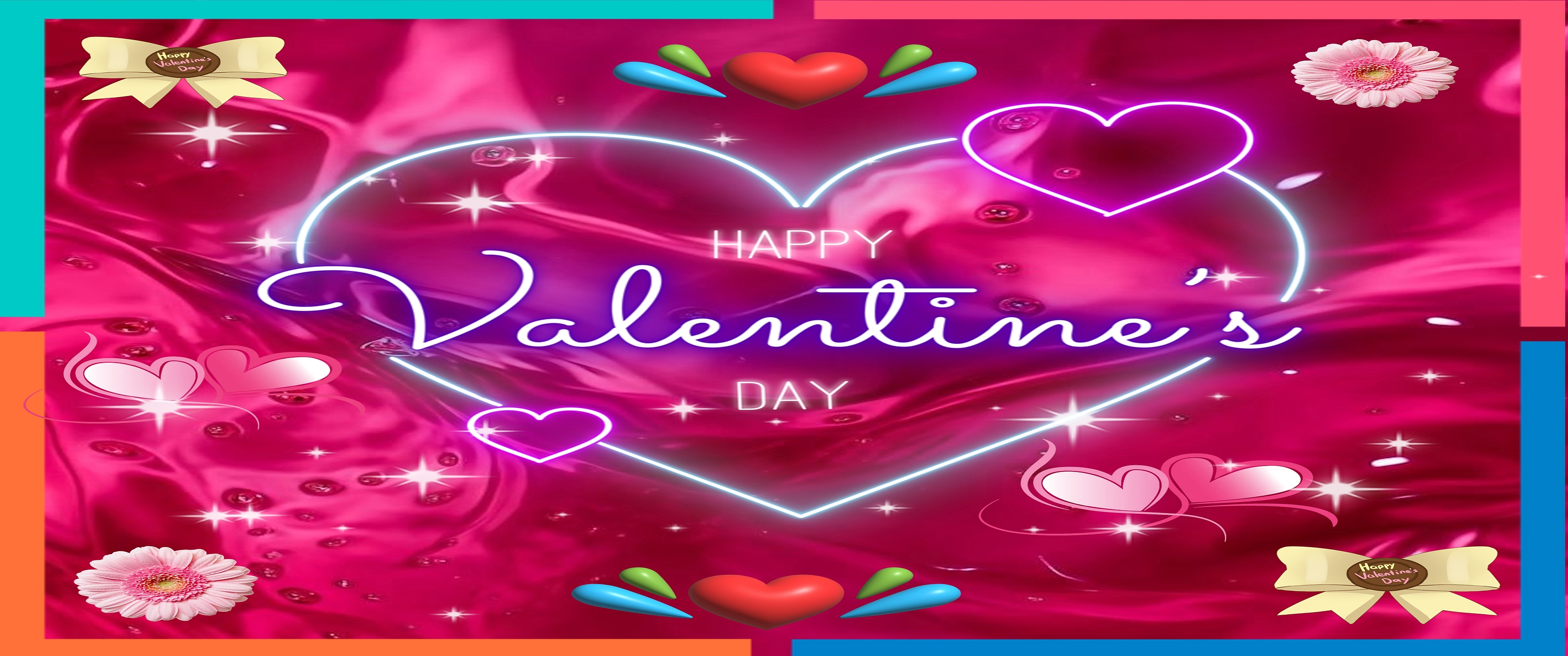Celebrate love and romance with this stunning Happy Valentine's Day Neon Heart wallpaper, a perfect blend of vibrant colors and sparkling effects. The main subject is a glowing neon heart outlined in bright blue and purple hues, centered against a rich, silky pink background that exudes warmth and passion. Surrounding the heart are delicate sparkles and smaller neon hearts, enhancing the festive and romantic atmosphere. This high-resolution wallpaper captures the essence of Valentine's Day with its vivid pink and red tones, complemented by soft purple highlights and neon blue accents, creating a visually captivating and joyful mood.