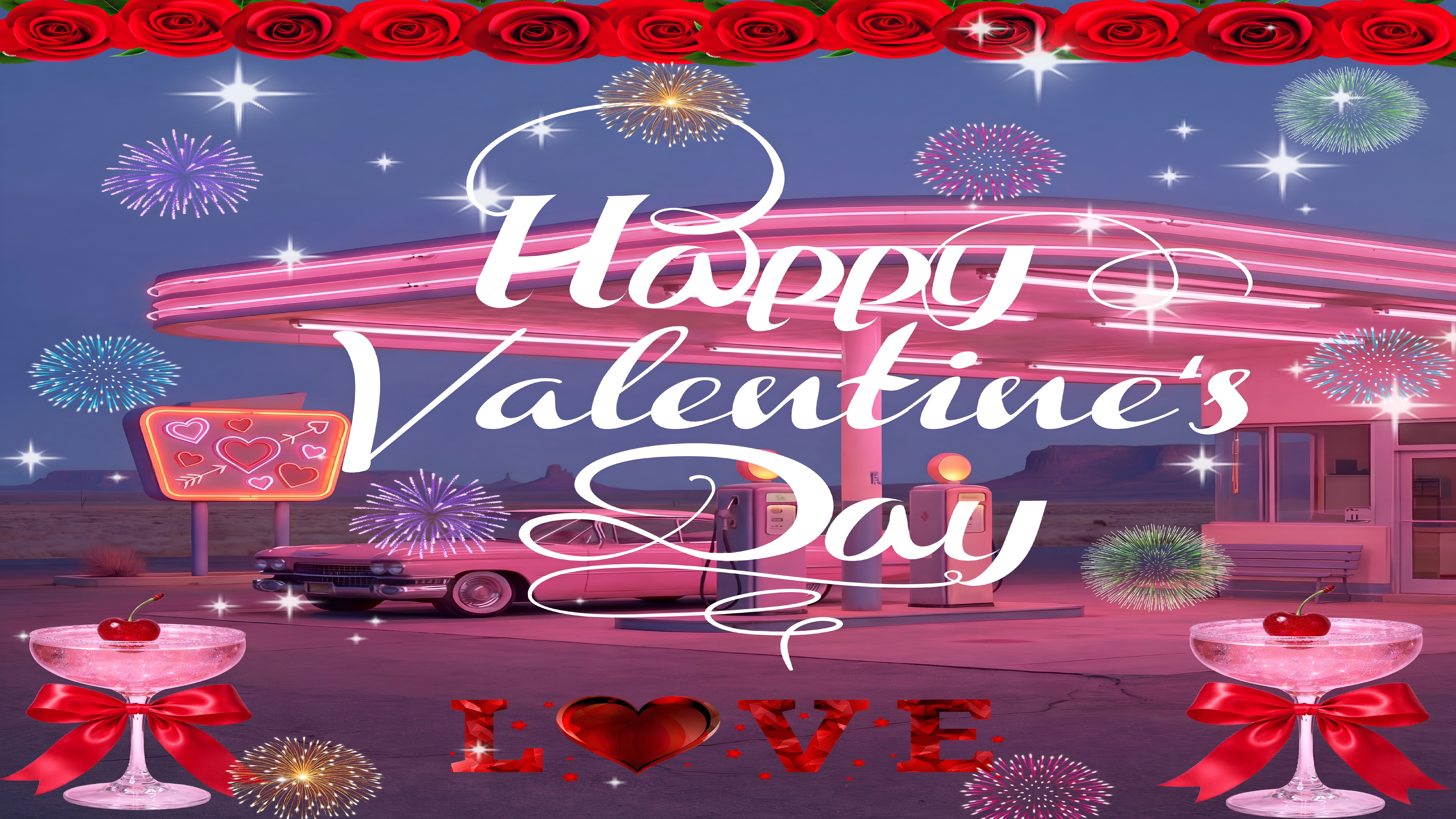This Happy Valentine's Day Neon Scene wallpaper captures a nostalgic yet festive atmosphere, blending retro charm with modern celebration. The main subject is a vintage pink car parked at a neon-lit gas station, glowing warmly under a twilight purple sky. The scene is framed with a vibrant border of deep red roses, enhancing the romantic theme. Fireworks burst in soft pastel colors above, adding a magical sparkle to the night. Two elegant cocktail glasses with cherries and red bows sit in the foreground, symbolizing celebration and love. The entire composition is bathed in vibrant pink neon hues, complemented by glowing white sparkles that create an enchanting ambiance.