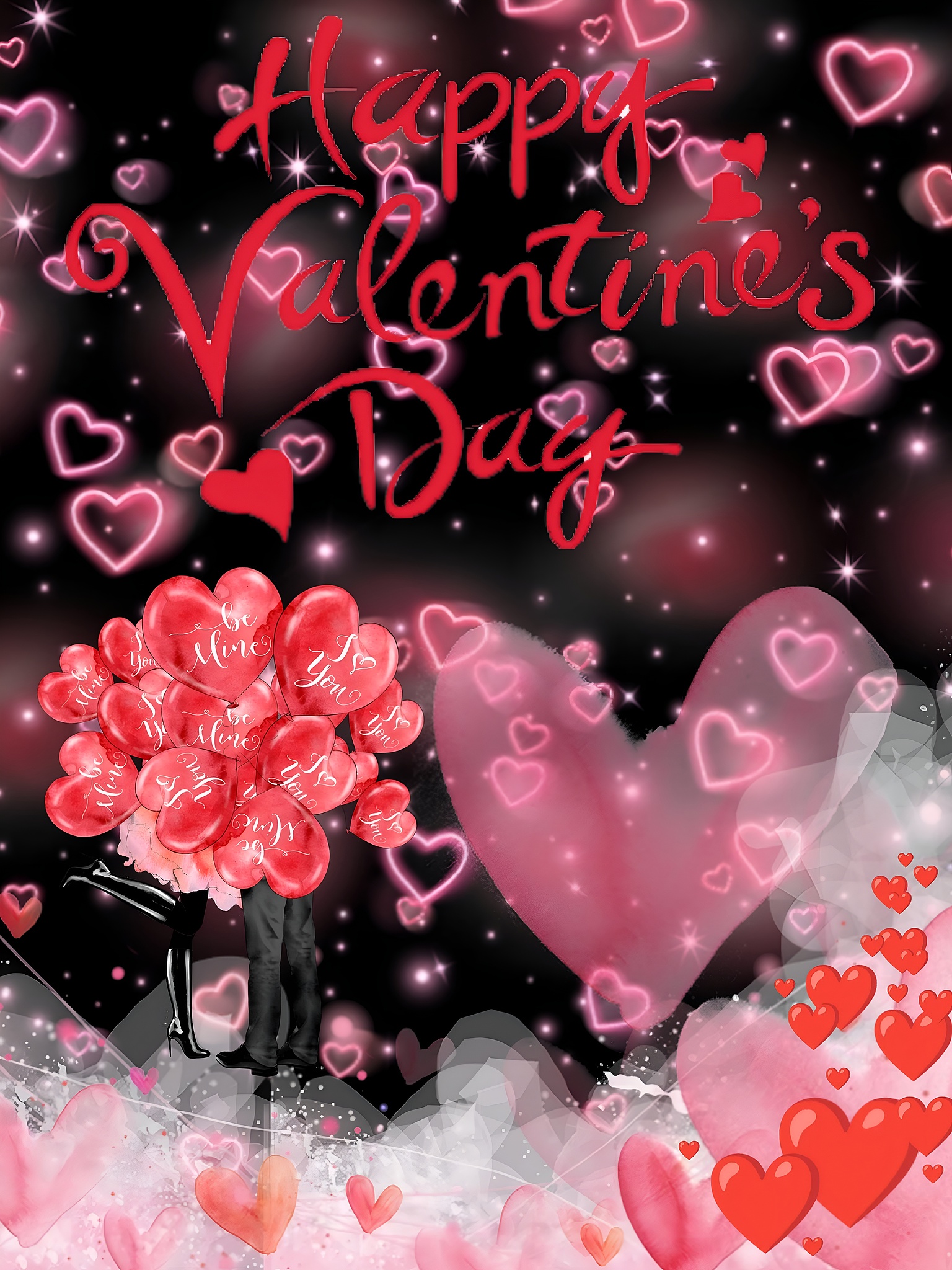 Celebrate love and romance with this enchanting Happy Valentine's Day Romantic Art wallpaper, designed to bring warmth and affection to your digital space. This high-resolution wallpaper features a captivating scene where a couple is embraced behind a cluster of heart-shaped balloons, each inscribed with loving messages like "Be Mine" and "I ♥ You." The image is set against a deep black background illuminated by glowing pink and red hearts that float softly, creating a dreamy and magical atmosphere perfect for Valentine’s Day or any romantic occasion.