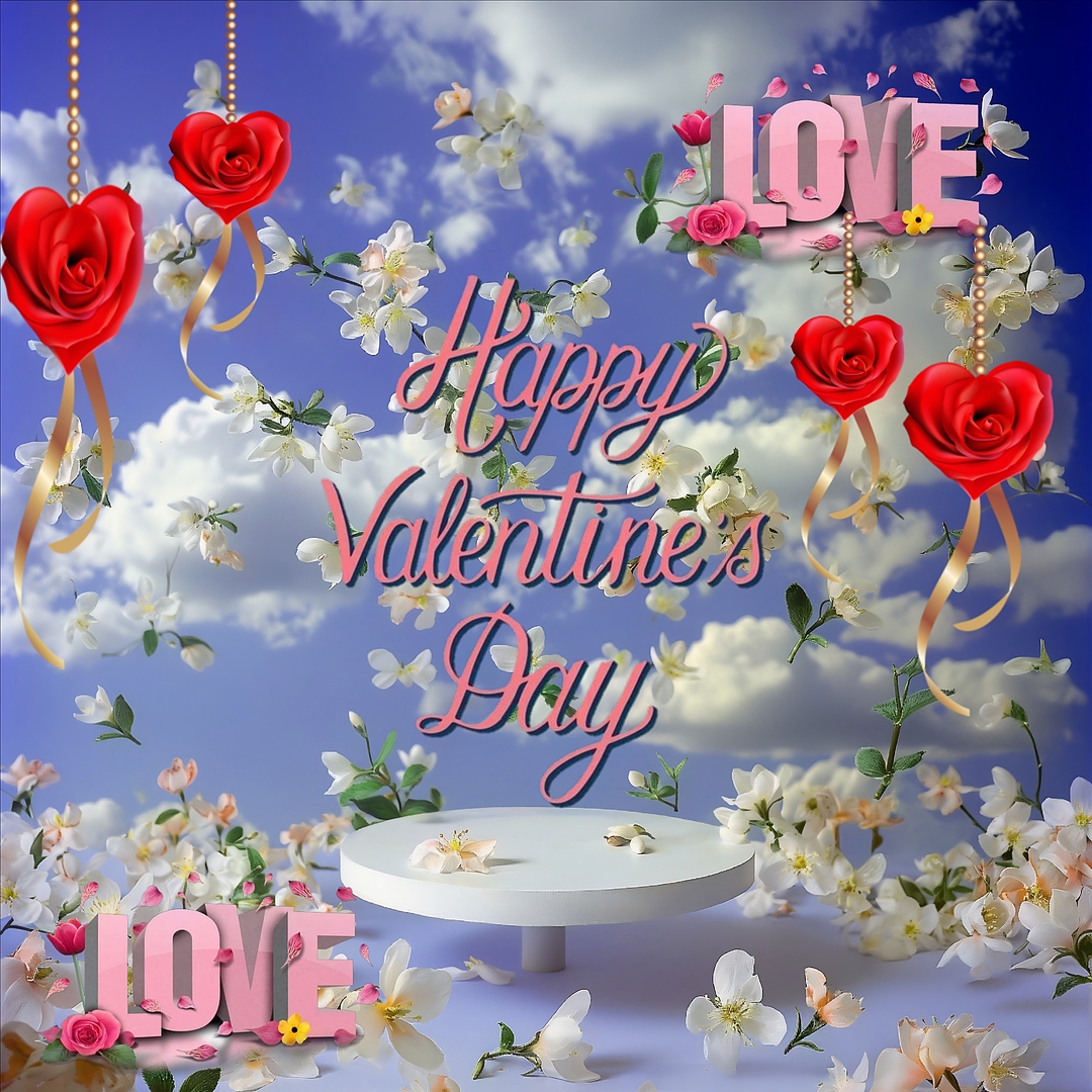 Celebrate the spirit of love and romance with this enchanting Happy Valentine's Day Romantic Art wallpaper. Featuring a dreamy sky-blue background adorned with fluffy white clouds, this high-resolution wallpaper captures the essence of springtime romance. The central focus is the elegant pink cursive typography that spells out “Happy Valentine's Day,” surrounded by delicate white blossoms that float gracefully across the scene. The vibrant red heart-shaped roses hanging with golden ribbons add a passionate touch, perfectly balancing the soft pastel palette with bursts of vivid color.