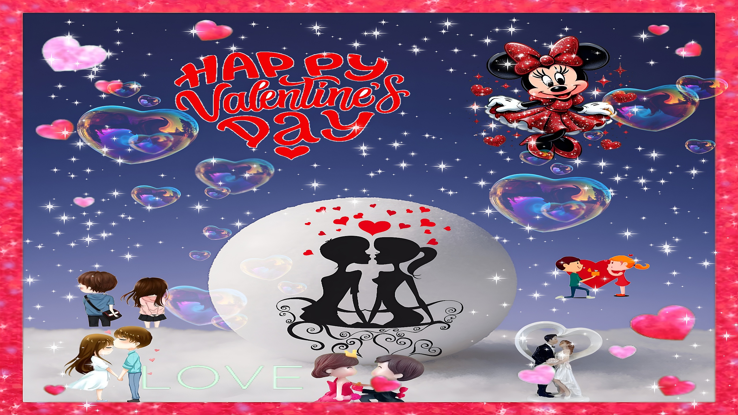 Celebrate love and affection with this enchanting Happy Valentine's Day Romantic Art wallpaper, designed to bring warmth and joy to your screen. The main focus is a large white orb featuring a delicate black silhouette of a couple sitting closely, surrounded by floating red hearts, symbolizing deep romantic connection. The backdrop is a dreamy navy blue night sky sprinkled with twinkling stars and shimmering heart-shaped bubbles, creating a magical atmosphere perfect for expressing love. This charming composition blends playful cartoon couples and the iconic Minnie Mouse dressed in a sparkling red outfit, adding a touch of whimsy and festive spirit to the scene.