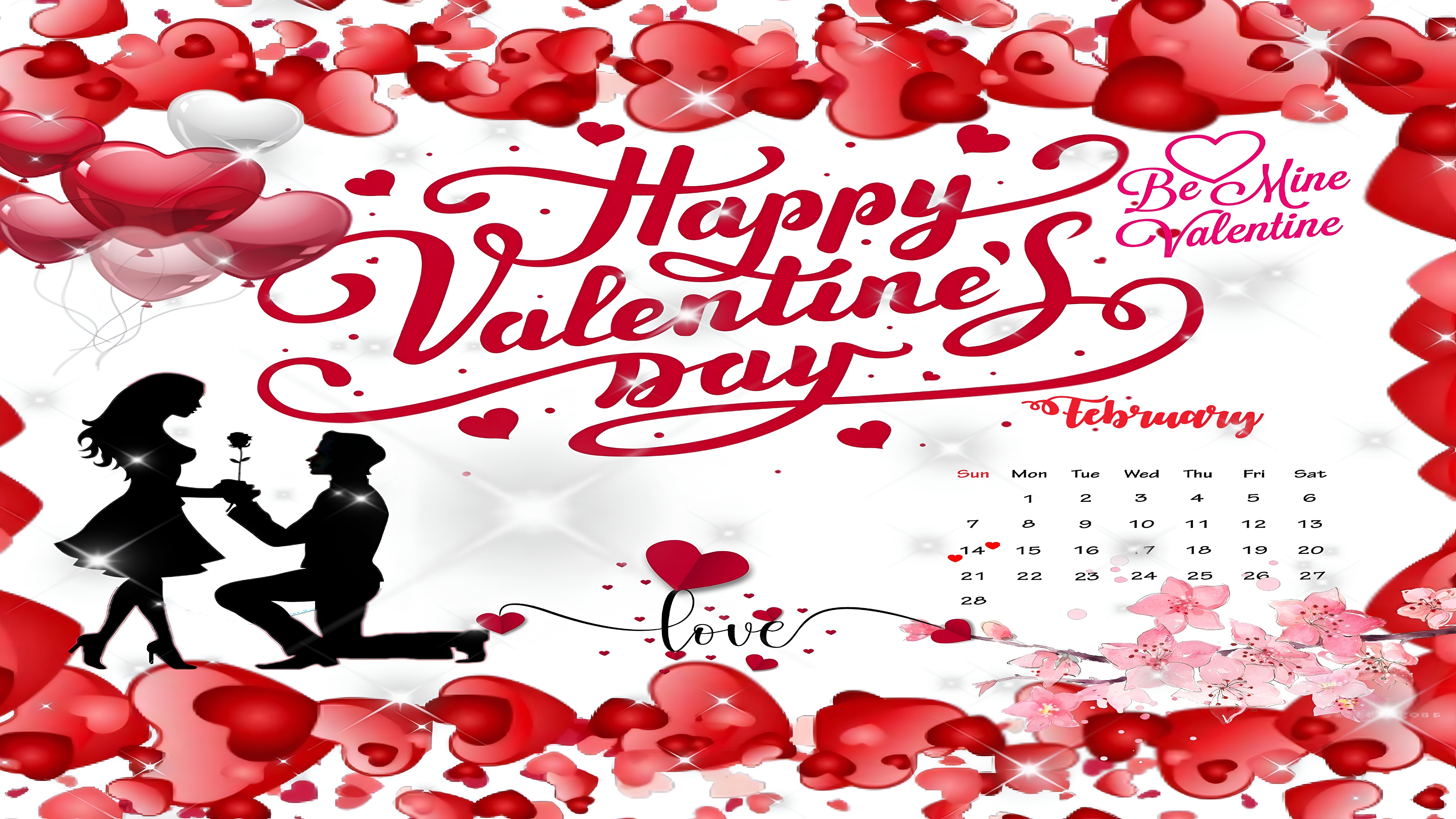Celebrate love and romance with this stunning Happy Valentine's Day Romantic Wallpaper, designed to bring warmth and affection to your digital devices. This high-resolution wallpaper features a beautifully scripted "Happy Valentine's Day" message in bold red calligraphy, surrounded by an abundance of heart-shaped balloons and delicate pink blossoms, creating a festive and loving atmosphere. The central silhouette of a man kneeling and offering a rose to a woman adds a heartfelt narrative of romance and devotion, making this wallpaper perfect for Valentine's Day or any occasion celebrating love.