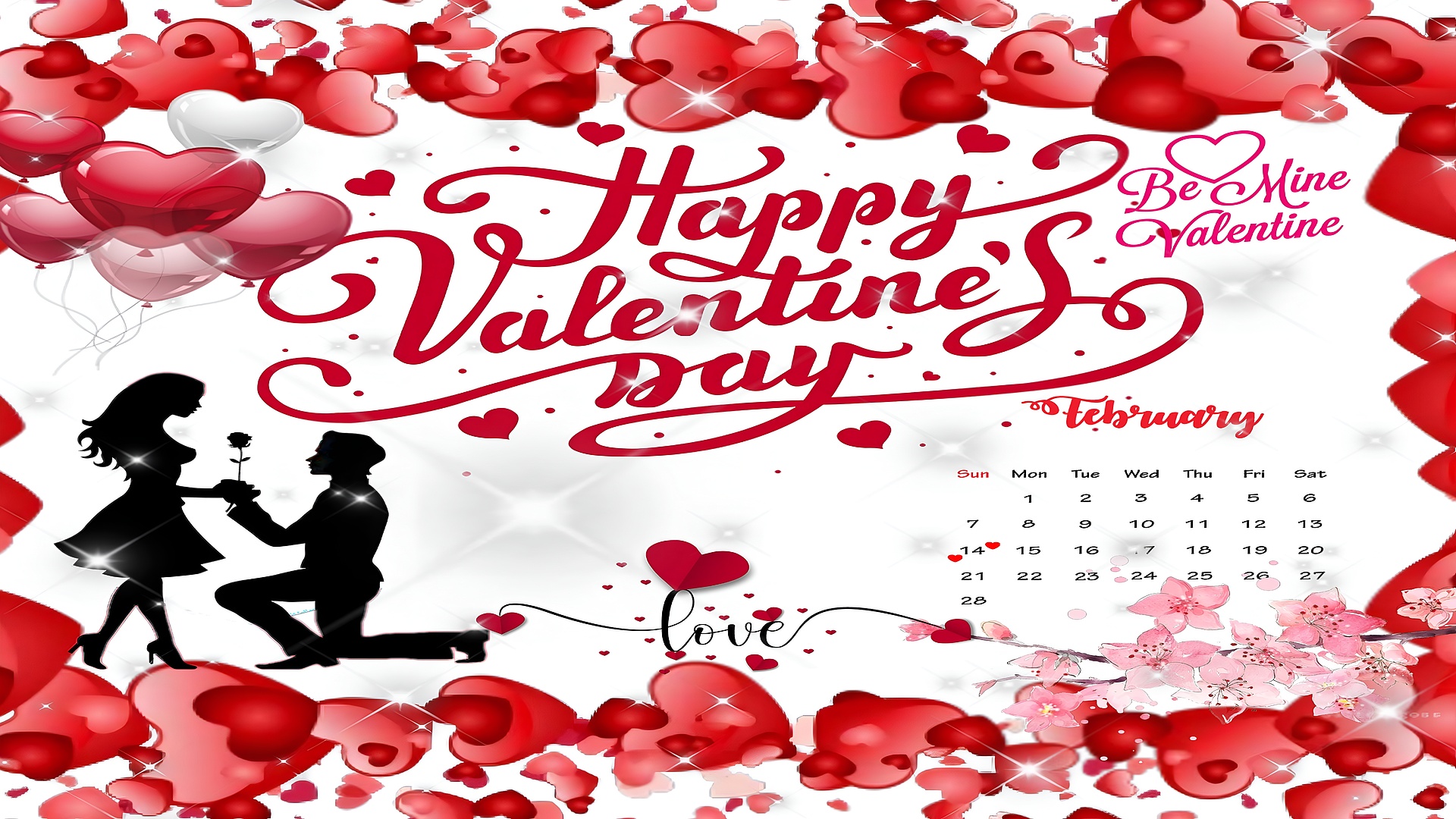 The wallpaper’s palette is dominated by vibrant reds and soft pinks, complemented by a crisp white background and contrasting black silhouettes. This combination creates a visually striking yet elegant design that enhances any desktop or mobile screen. The inclusion of a February calendar with a highlighted Valentine's Day date adds a practical yet charming touch, making it both decorative and functional. The sparkling highlights and glossy heart balloons add depth and a touch of magic, perfect for lovers of romantic and festive digital art.