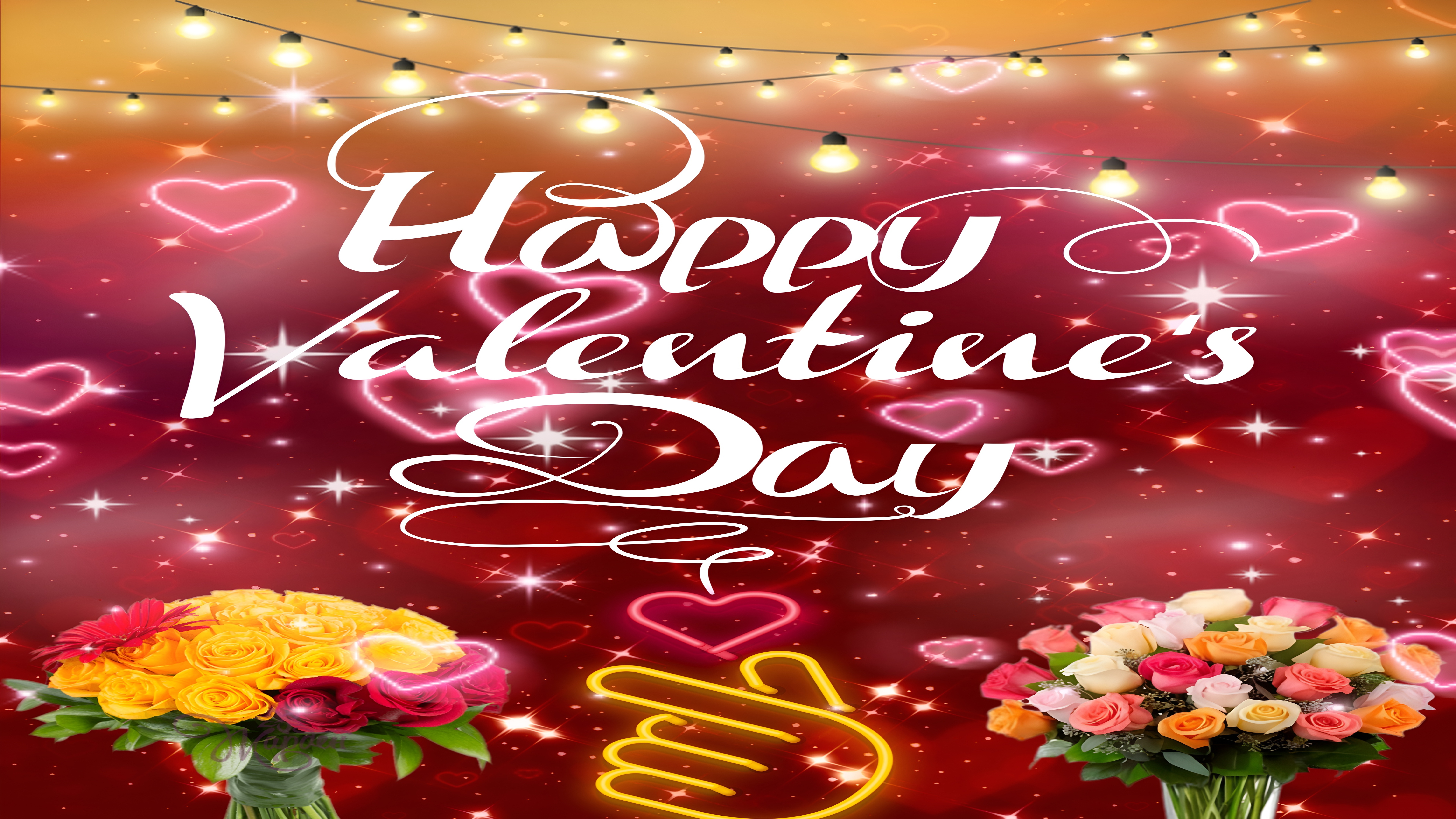The Happy Valentine's Day Romantic Wallpaper features a harmonious blend of romantic elements that appeal to lovers of festive and heart-themed designs. The glowing hearts scattered throughout the background create a sense of depth and movement, while the string lights add a cozy, intimate ambiance reminiscent of romantic evening gatherings. The two flower bouquets bring a burst of natural beauty with their vivid yellow, red, peach, and pink roses, symbolizing passion, friendship, and affection. This wallpaper is perfect for those searching for Valentine’s Day desktop backgrounds, mobile wallpapers, or romantic wall art that combines floral elegance with glowing neon accents. The use of warm red and soft pink tones alongside golden yellow lighting creates a visually appealing contrast that enhances the festive mood.