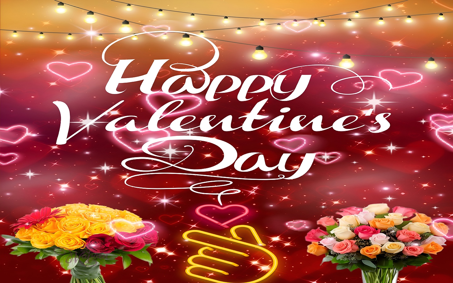 This Happy Valentine's Day Romantic Wallpaper captures the essence of love and celebration with a visually stunning composition perfect for any romantic occasion. The main subject is the elegantly scripted "Happy Valentine's Day" text, centered prominently against a rich, glowing red and pink background filled with sparkling stars and glowing heart shapes. The scene is beautifully enhanced by warm string lights hanging across the top, casting a soft golden glow that adds depth and warmth to the overall atmosphere. Two vibrant bouquets of flowers, one with yellow and red roses and the other with a mix of pastel-colored roses, frame the bottom corners, adding a natural and colorful touch to this festive design.