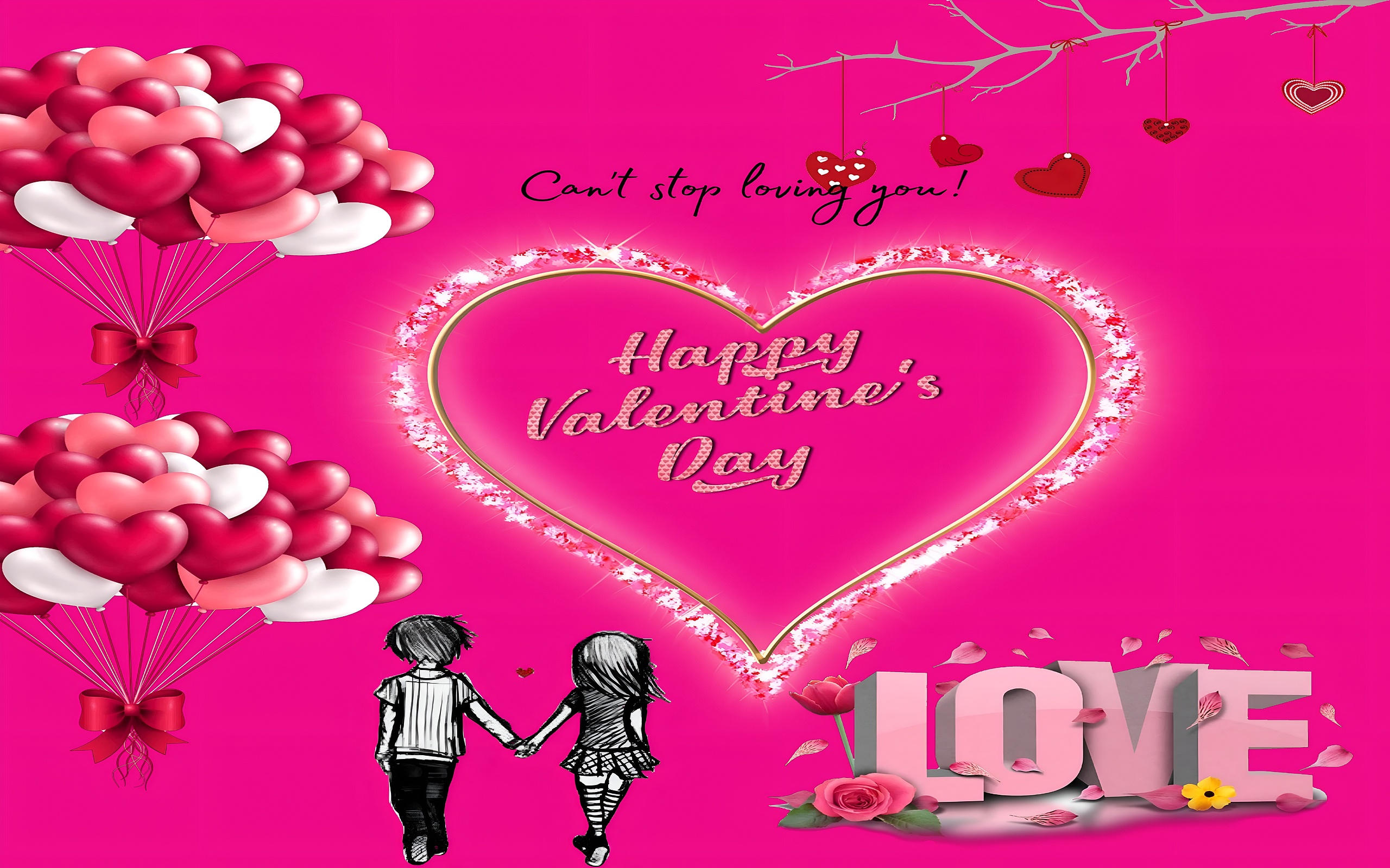 Romantic wallpapers like this Happy Valentine's Day Romantic Wallpaper are designed to evoke feelings of warmth, affection, and joy. The use of vibrant pink, deep red, soft white, and pastel peach colors creates a harmonious palette that symbolizes love, passion, and tenderness. The heart-shaped balloons and glowing heart frame are classic symbols of romance, while the hand-drawn couple illustration adds a personal, heartfelt dimension. This blend of digital sparkle and hand-drawn art appeals to those seeking high-resolution wallpaper that combines both modern and nostalgic elements. Such wallpapers are ideal for desktop backgrounds, mobile wallpapers, or even wall art, offering a premium visual experience that celebrates love in a stylish and heartfelt way.