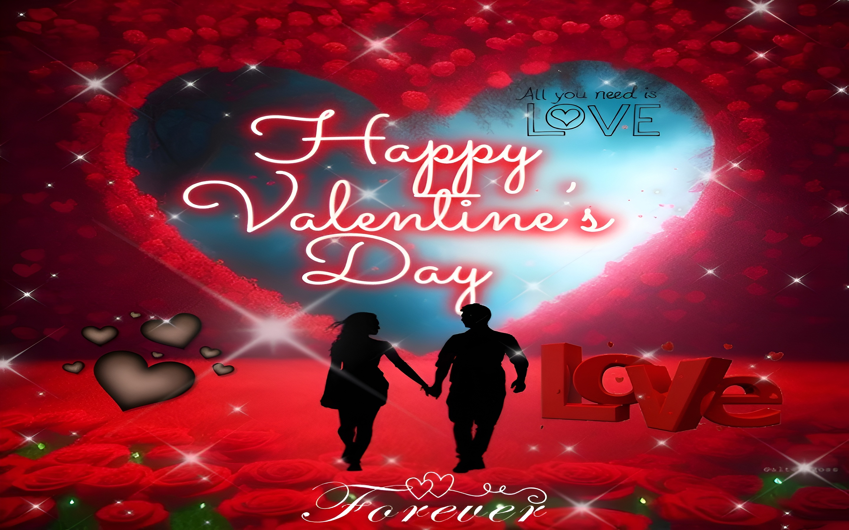 The focal point of this wallpaper is the silhouette of a couple holding hands, symbolizing unity and affection. The black silhouette stands out against the vibrant red roses and the glowing heart-shaped background, emphasizing intimacy and connection. The large 3D red "Love" text adds depth and dimension, reinforcing the theme of romance. Sparkling star-like accents scattered across the image add a magical touch, enhancing the overall mood. This wallpaper is perfect for those seeking romantic HD desktop backgrounds, mobile wallpapers, or love-themed wall art that captures the spirit of Valentine's Day and heartfelt emotions.