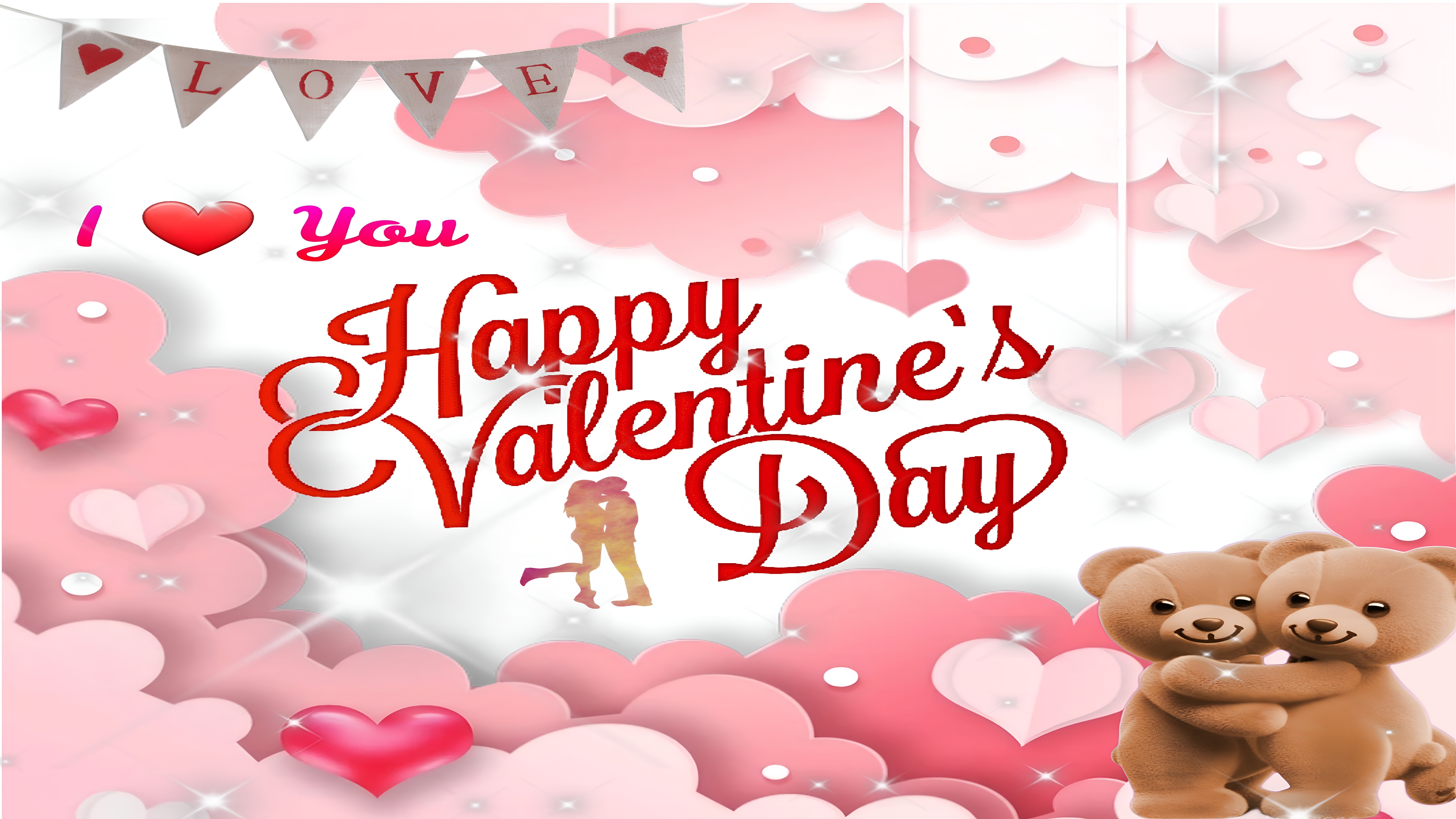 This Happy Valentine's Day Romantic Wallpaper captures the essence of love and affection with a charming and heartwarming design. The main subject features a vibrant "Happy Valentine's Day" greeting in elegant red script, surrounded by soft pink and white heart shapes that create a dreamy, cloud-like frame. Two adorable teddy bears embracing in the bottom right corner add a playful and tender touch, enhancing the romantic atmosphere. The background is filled with delicate hanging hearts and a festive banner spelling "LOVE," making it perfect for celebrating Valentine's Day or expressing heartfelt emotions.