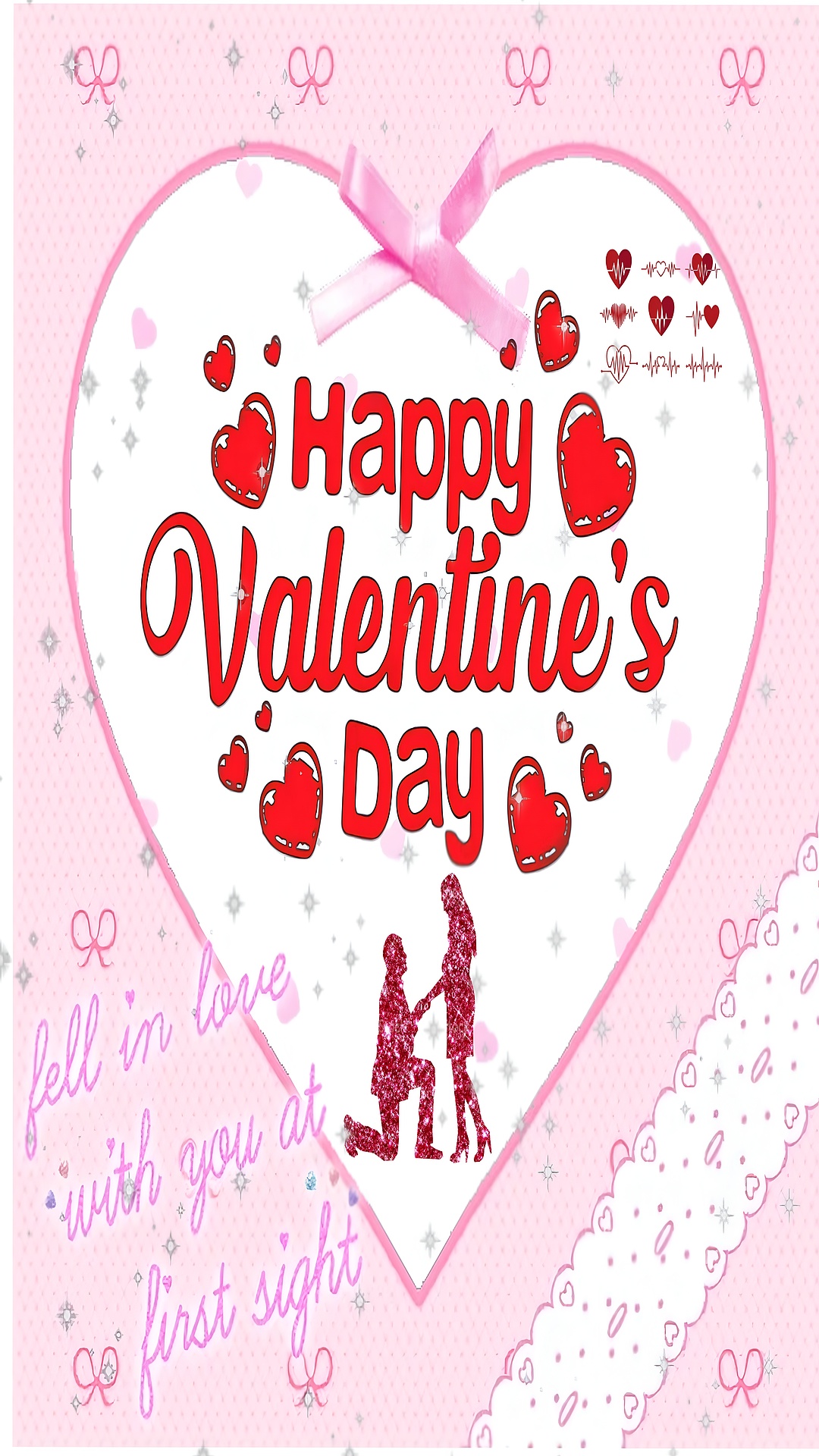 This Happy Valentine's Day Romantic Heart wallpaper captures the essence of love and romance with a charming and heartwarming design. At the center, a large white heart framed with a soft pink border draws immediate attention, adorned with a delicate pink ribbon bow at the top. Inside the heart, bold red lettering spells out “Happy Valentine’s Day” surrounded by playful red hearts, creating a joyful and affectionate atmosphere perfect for celebrating love. Below the text, a glittery red silhouette of a man kneeling and proposing to a woman adds a tender, emotional touch that resonates deeply with themes of romance and commitment.