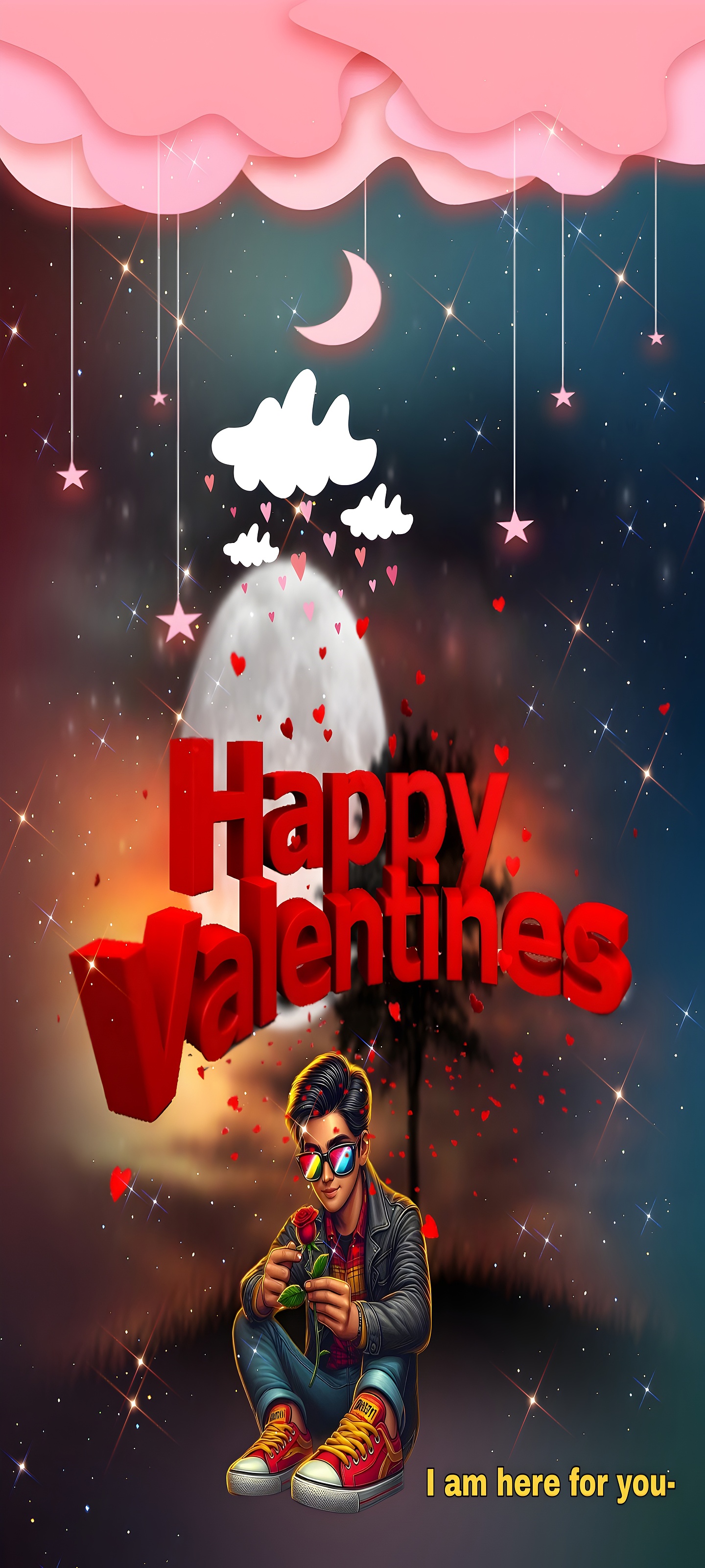 This high-resolution wallpaper showcases a blend of digital art techniques, combining sharp 3D text effects with soft, glowing elements like the moon and stars. The use of vibrant red for the "Happy Valentines" message and heart shapes immediately conveys passion and romance. The character’s detailed clothing textures, such as the leather jacket and plaid shirt, add realism and depth. The reflective sunglasses introduce a playful, modern twist, while the warm orange glow behind the character balances the cooler blue tones of the night sky. This wallpaper’s 4320×6480 resolution ensures crisp detail on large displays, making it perfect for desktop backgrounds, mobile wallpapers, or wall art for tablets and laptops.