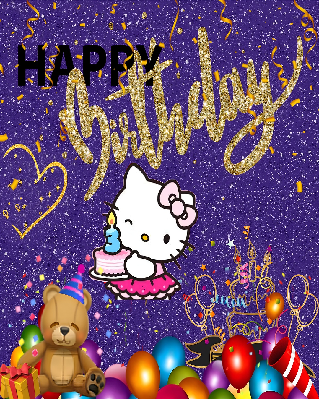 The wallpaper’s dominant colors include a deep purple glitter background that sets a magical tone, complemented by golden sparkle accents that add elegance and festivity. The multicolored balloons bring in lively hues of red, orange, blue, green, and purple, creating a joyful and dynamic composition. Soft pink highlights on Hello Kitty’s outfit and the birthday cake add a gentle, charming contrast. The confetti and party elements scattered throughout the image enhance the celebratory mood, making this wallpaper perfect for users searching for cute cartoon backgrounds, birthday HD wallpapers, or colorful party wallpapers. The combination of these colors and decorative details creates a visually appealing and cheerful desktop background or mobile wallpaper.