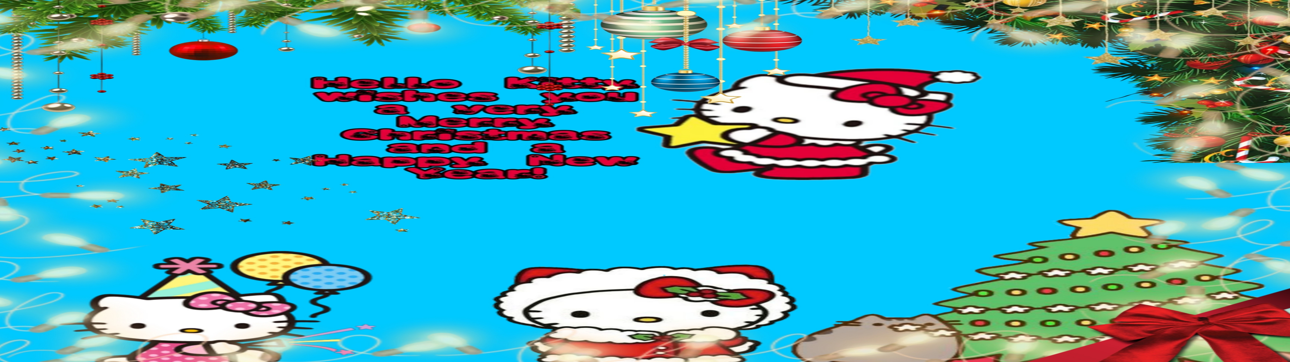 Celebrate the holiday season with our delightful Hello Kitty Christmas HD wallpaper. This vibrant wallpaper features the beloved character Hello Kitty dressed in a festive Santa outfit, radiating joy and warmth against a bright blue background. The cheerful scene is adorned with a beautifully decorated Christmas tree, complete with colorful ornaments and a shining star, creating a whimsical atmosphere perfect for the holidays. The playful design captures the essence of Christmas, making it an ideal choice for anyone looking to add a touch of Kawaii charm to their desktop or mobile device.