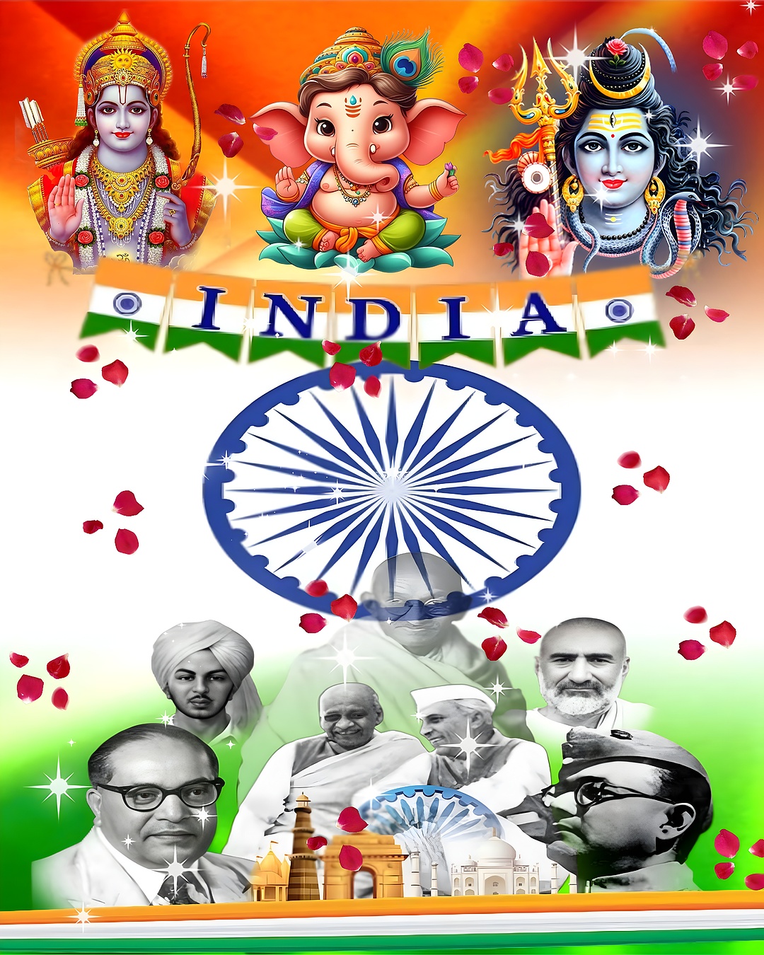 This India Patriotic Icons HD Wallpaper beautifully captures the essence of Indian culture, history, and spirituality in a vibrant and artistic composition. The wallpaper prominently features the Indian tricolor with saffron orange at the top, white in the middle, and India green at the bottom, symbolizing courage, peace, and growth respectively. At the center lies the deep blue Ashoka Chakra, a 24-spoke wheel representing the eternal wheel of law and progress. Surrounding this iconic symbol are revered figures from Indian history and mythology, including detailed illustrations of Hindu deities Lord Rama, Lord Ganesha, and Lord Shiva, each depicted with intricate ornaments and divine attributes. The background radiates warmth with a glowing orange gradient, enhancing the spiritual and patriotic mood.