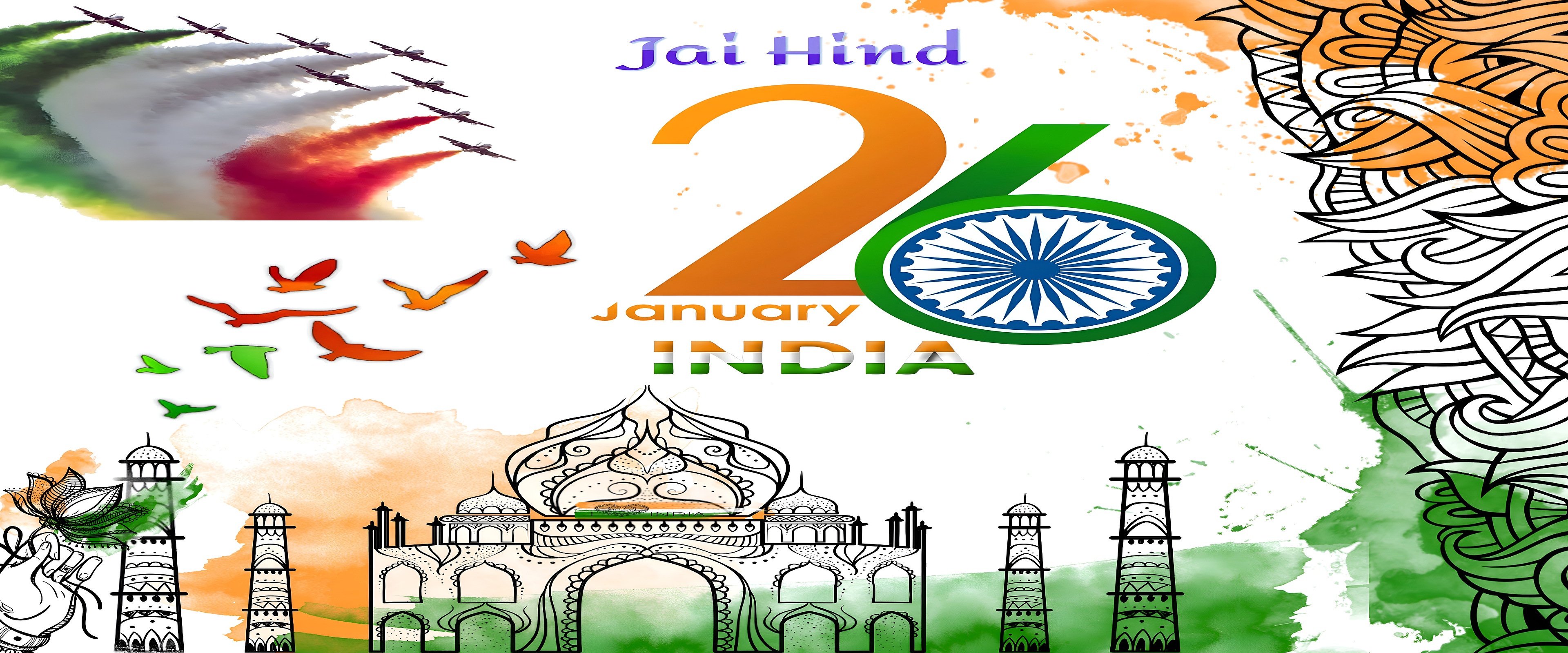 This India Republic Day Celebration Art wallpaper uses a rich palette of saffron orange, white, and India green, reflecting the Indian flag's colors with subtle watercolor textures that create a warm and inviting atmosphere. The navy blue Ashoka Chakra stands out as a symbol of law and dharma, central to the design. The black ink-style architectural sketch adds a timeless cultural dimension, while the airshow jets with colored smoke trails inject a sense of national pride and festivity. The flying birds in tri-color shades symbolize freedom and hope, enhancing the wallpaper’s theme of unity and patriotism. This wallpaper’s blend of traditional motifs and modern graphic elements makes it a perfect choice for high-resolution wallpaper enthusiasts seeking a meaningful and visually striking desktop background or mobile wallpaper.