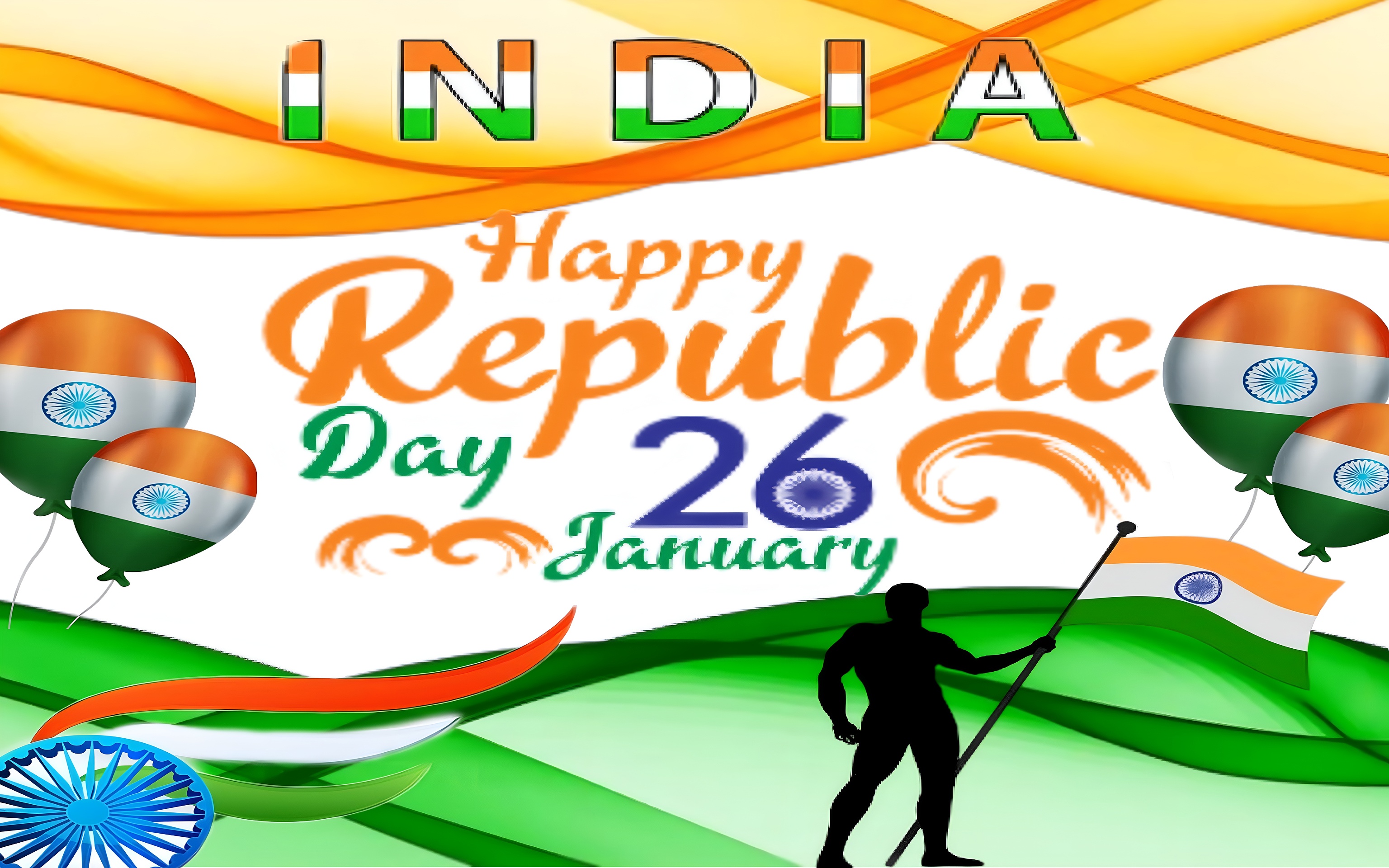 This high-definition wallpaper uses a harmonious blend of saffron orange, white, and India green colors, representing courage, peace, and faith respectively, while the navy blue Ashoka Chakra symbolizes law and dharma. The balloons floating on either side, decorated with the Indian flag, add a festive and uplifting atmosphere. The flowing ribbons and waves create a sense of fluidity and celebration, while the silhouette holding the flag embodies patriotism and pride. The clean white background enhances the vibrancy of the tricolor elements, making the design pop on any screen. This wallpaper is ideal for those seeking a patriotic mobile wallpaper, desktop background, or wall art that captures the essence of India's Republic Day with clarity and elegance.
