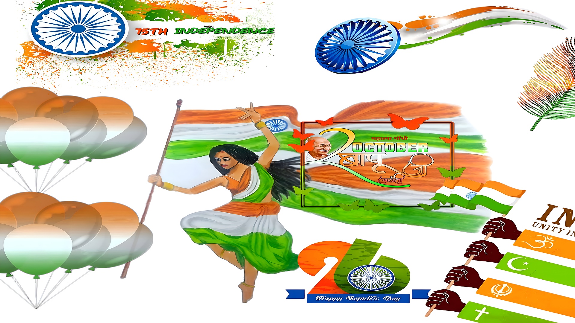 This wallpaper integrates key cultural symbols such as the Ashoka Chakra, which represents law and dharma, and the tri-color Indian flag, a powerful emblem of freedom and unity. The inclusion of a dancing woman in traditional attire highlights the rich cultural heritage and joyous spirit of Indian celebrations. The design also features a tribute to Mahatma Gandhi with text referencing October 2nd, his birth anniversary, adding a historical and respectful dimension to the artwork. The presence of multiple hands holding flags with religious symbols underscores the theme of unity in diversity, a core value celebrated during Indian national holidays. This makes the wallpaper not only visually appealing but also deeply meaningful for viewers seeking patriotic and cultural wall art.