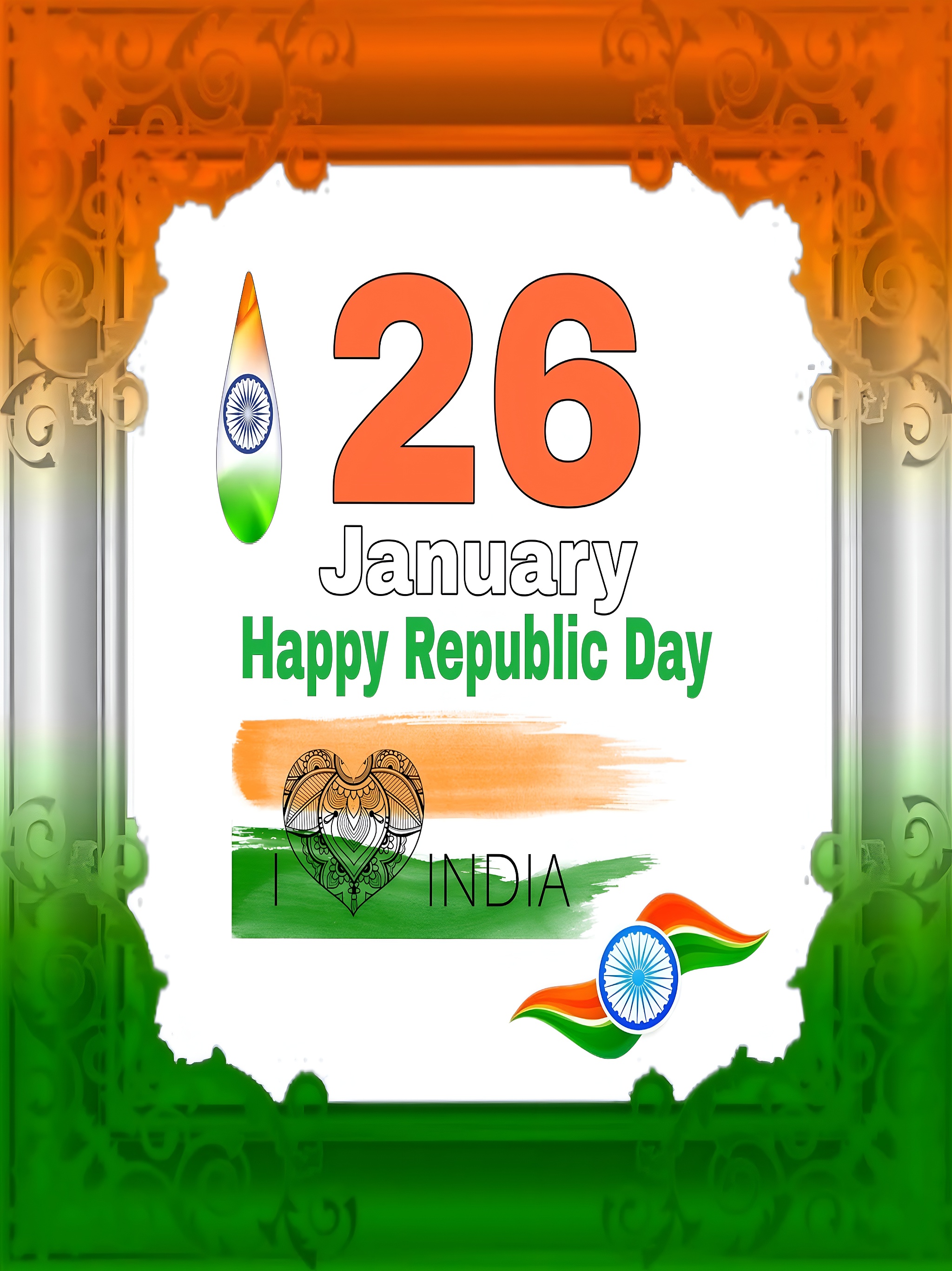 This vibrant 26 January Happy Republic Day wallpaper beautifully captures the spirit of India's Republic Day celebration with a clean and festive design. The main subject features the bold date "26" in bright saffron orange, symbolizing courage and sacrifice, paired with the words "January" and "Happy Republic Day" in crisp black and green fonts. The design is framed by an ornate border that transitions from saffron orange at the top to white in the middle and green at the bottom, echoing the Indian national flag's tricolor palette. This artistic use of color creates a warm and patriotic atmosphere perfect for commemorating this significant day.