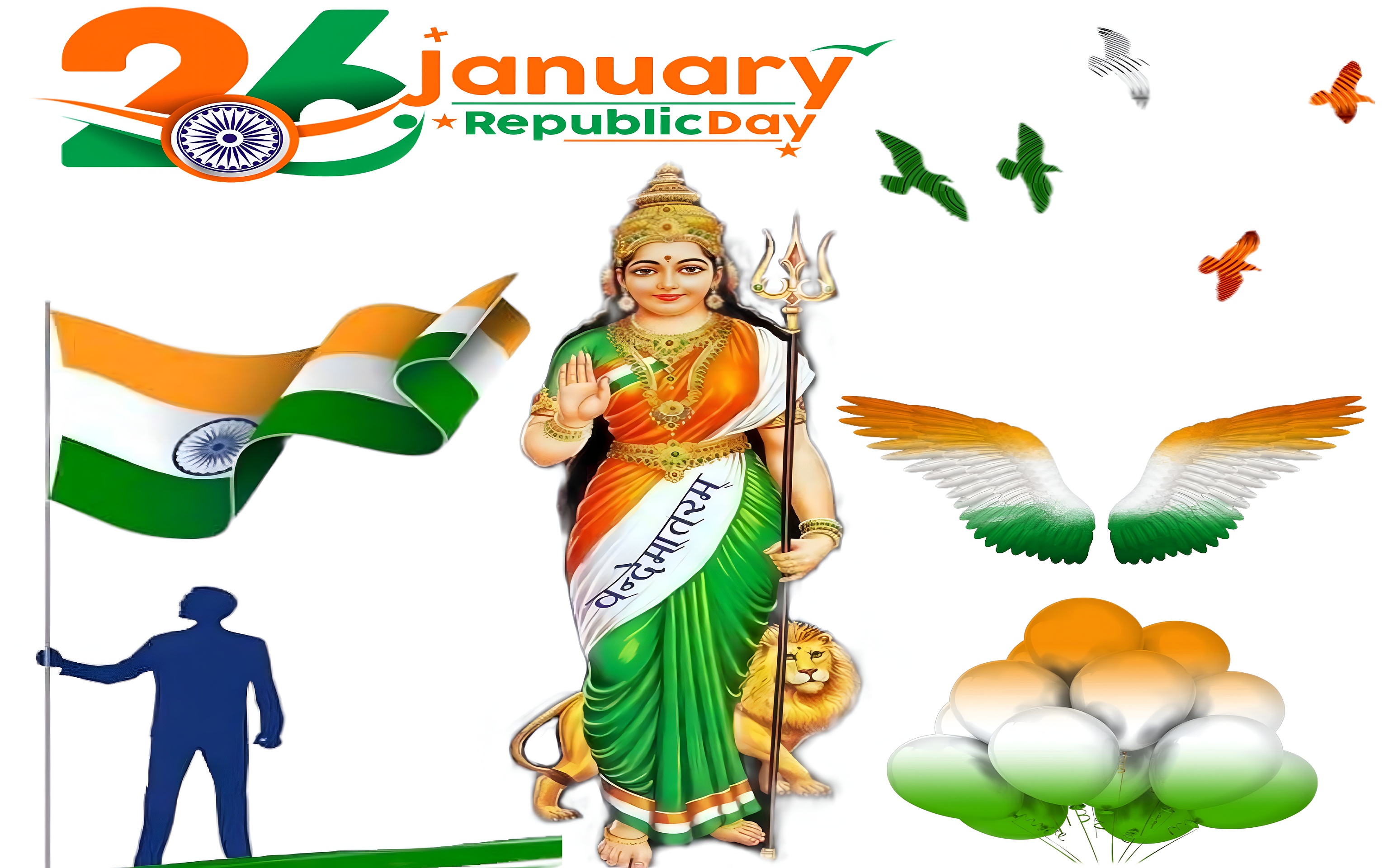 This 26 January Republic Day Celebration HD Wallpaper beautifully captures the spirit of India’s national pride with a vibrant and symbolic composition. The central figure is Bharat Mata, depicted in a traditional sari colored in the Indian tricolor of saffron orange, white, and green, holding a trident and accompanied by a majestic lion. Her serene expression and blessing gesture evoke a sense of unity and reverence. The backdrop is minimalistic white, allowing the bright colors of the Indian flag and patriotic symbols to stand out vividly, creating a clean and powerful visual impact.
