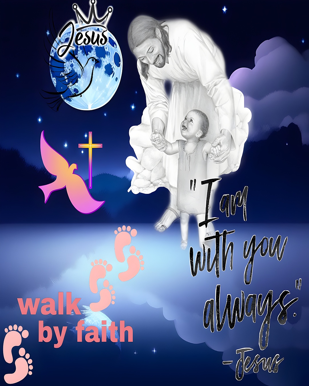 Jesus child night walk HD wallpaper captures a heartwarming spiritual moment: Jesus in white robes gently guiding a small child across a reflective nightscape. The scene is rich with symbolism—pink footprints trail across the water, echoing the message “walk by faith,” while a crowned moon bearing the name “Jesus” and a pink dove flying toward a golden cross reinforce themes of peace and divine presence. The tranquil starry sky and soft clouds create a calming backdrop, ideal for reflection and inspiration. With the comforting quote “I am with you always – Jesus,” this image offers daily reassurance and spiritual warmth. Perfect for those seeking a meaningful, faith-centered wallpaper that blends beauty with belief.