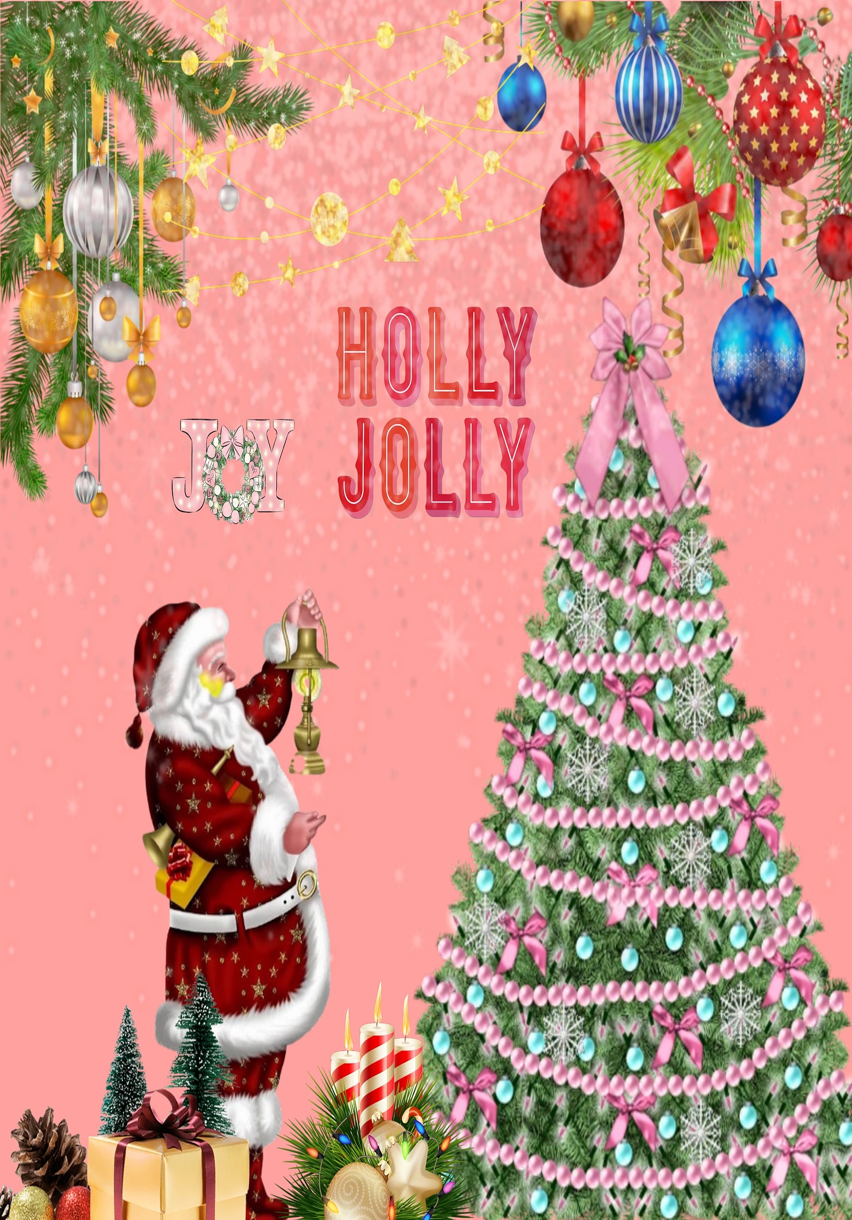 Embrace the holiday spirit with our Joyful Christmas HD Wallpaper, a delightful depiction of Santa Claus celebrating the season. This vibrant image features a beautifully decorated Christmas tree adorned with sparkling ornaments and twinkling lights, set against a soft pink backdrop that radiates warmth and joy. The scene captures the essence of Christmas, with Santa joyfully ringing a bell, inviting all to partake in the festive cheer. The rich colors, including vibrant red and emerald green, create a lively atmosphere that is perfect for bringing holiday joy to your digital devices.