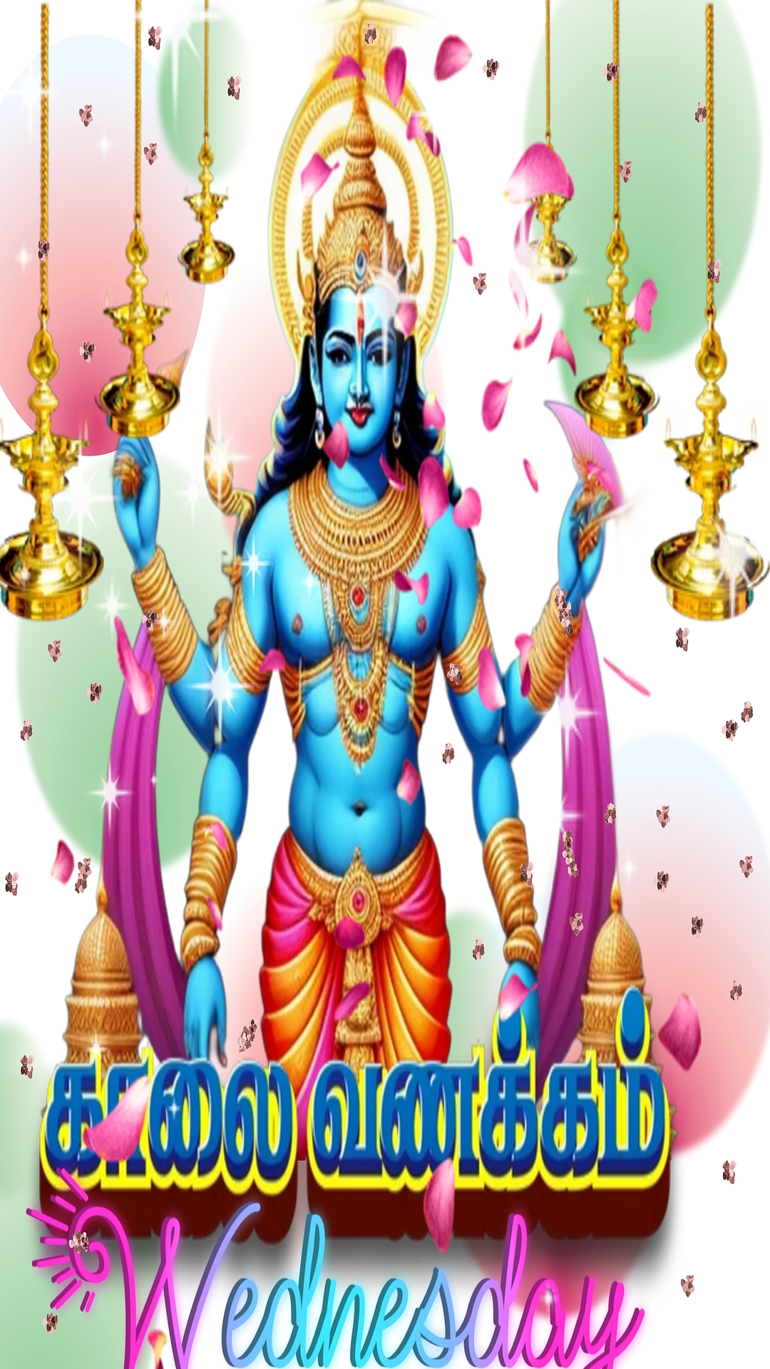 This Lord Vishnu Wednesday Blessing Wallpaper captures the divine essence of Lord Vishnu, one of Hinduism's principal deities, depicted with his iconic blue skin and adorned in intricate golden jewelry. The image showcases Vishnu standing gracefully, surrounded by a shower of pink flower petals that add a dynamic and celebratory atmosphere. The deity’s multiple arms hold symbolic items, emphasizing his divine powers, while the golden hanging lamps above enhance the spiritual ambiance. This high-resolution wallpaper blends traditional religious iconography with a modern digital art style, making it perfect for devotional desktop backgrounds or mobile wallpapers.