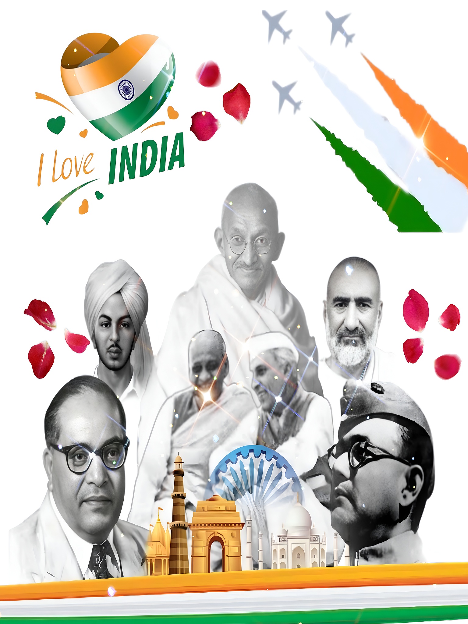 This high-resolution wallpaper titled I Love India Patriotic Collage beautifully honors the spirit of Indian independence and patriotism. The main subjects are prominent Indian freedom fighters and national heroes, including Mahatma Gandhi, Bhagat Singh, Dr. B.R. Ambedkar, and Subhas Chandra Bose, presented in a respectful and artistic black-and-white style. The collage is enriched with symbolic elements like the Indian tricolor heart, rose petals, and silhouettes of fighter jets leaving trails in saffron, white, and green, evoking a sense of pride and national unity. The artwork also features iconic Indian landmarks such as the Taj Mahal, India Gate, Qutub Minar, and the Ashoka Chakra, grounding the composition in cultural heritage and history.