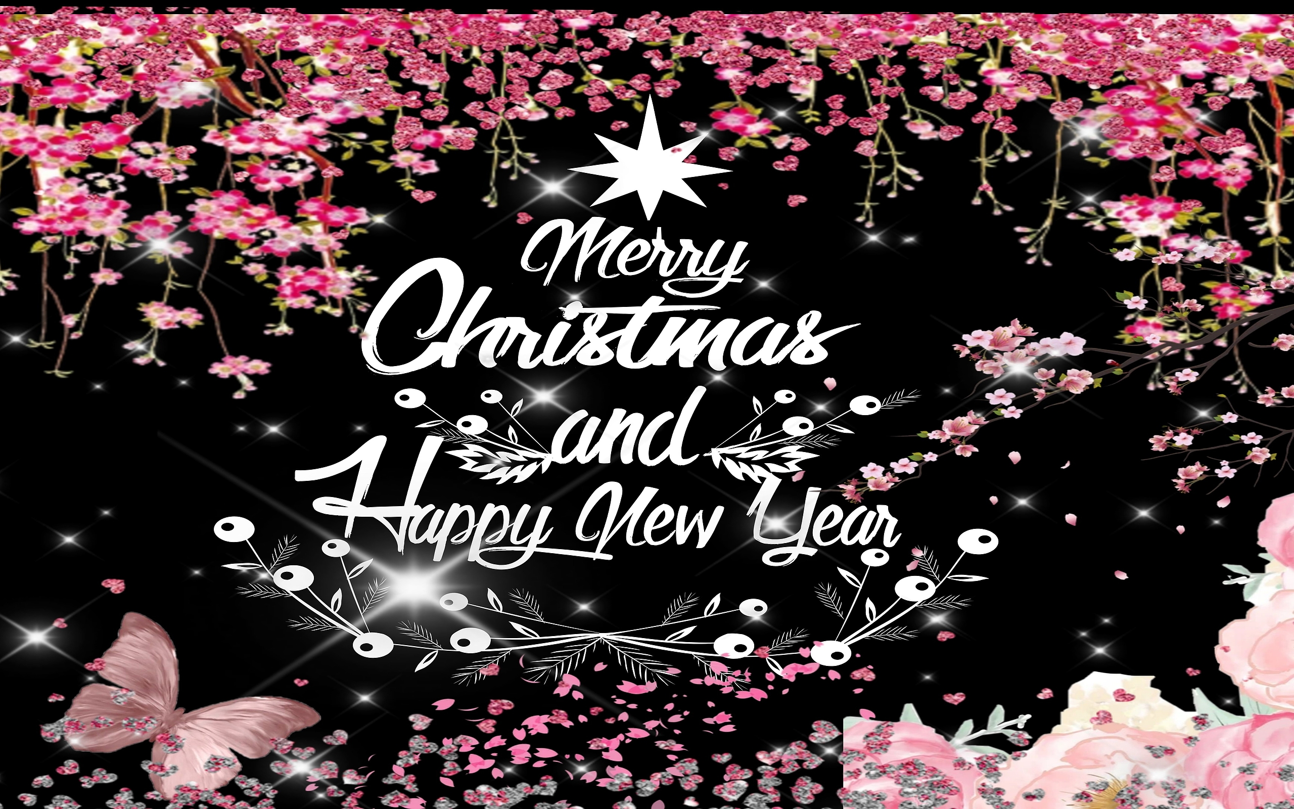 This Merry Christmas and Happy New Year Floral Wallpaper beautifully captures the festive spirit with an elegant and artistic design. The main subject is a warm holiday greeting displayed in a stylish white script font, framed by delicate white floral illustrations that resemble a Christmas tree shape. Surrounding the text are vibrant pink blossoms cascading from the top and scattered petals along the bottom, set against a deep black background that enhances the colors and adds a sophisticated contrast. The wallpaper radiates a joyful and celebratory mood, perfect for welcoming the holiday season with grace and charm.