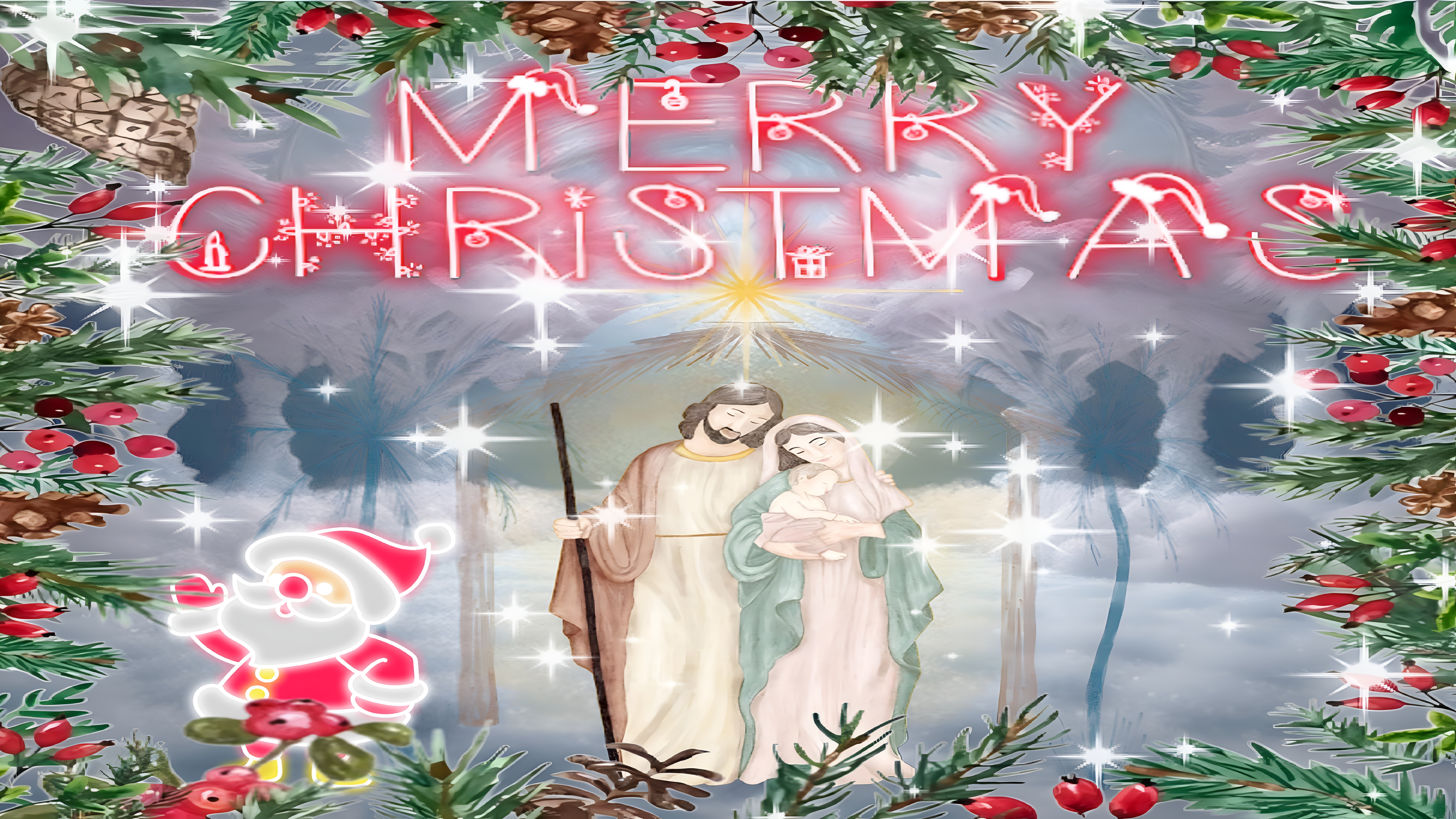 Merry Christmas Nativity Scene is a heartwarming HD wallpaper that beautifully captures the spirit of the holiday season. At its center, Joseph and Mary stand beneath a glowing star, symbolizing the nativity and the birth of hope. The snowy background, adorned with twinkling lights and evergreen trees, evokes a serene winter wonderland. The top of the image features bold, candy-striped “MERRY CHRISTMAS” text with playful icons like a Christmas tree and house, adding a joyful touch.