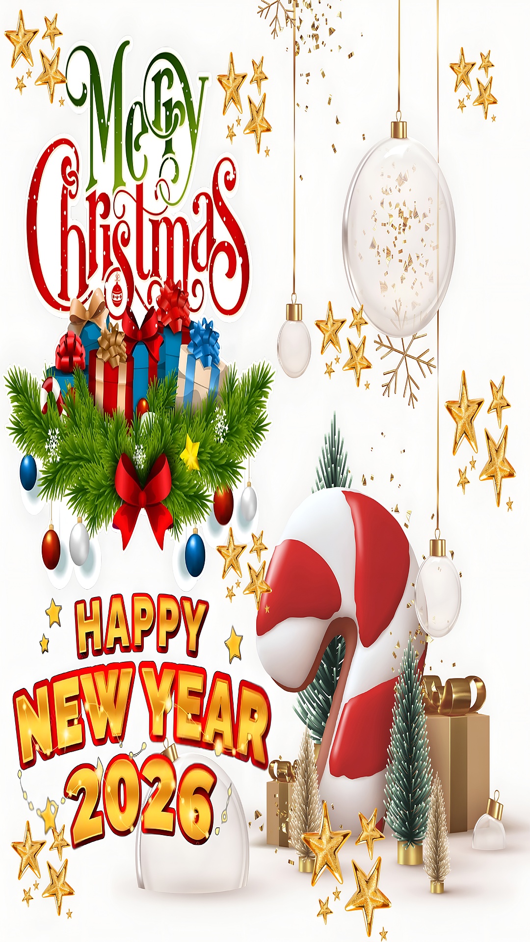 Celebrate the season with this vibrant HD wallpaper that blends the warmth of Christmas and the excitement of New Year 2026. The top features a joyful “Merry Christmas” greeting in classic red and green, while the bottom bursts with “HAPPY NEW YEAR 2026” in bold yellow and red. Between them lies a lush pine arrangement adorned with golden stars, candy canes, transparent ornaments, miniature trees, and colorful gift boxes—capturing the essence of holiday magic. Perfect for spreading festive vibes, this wallpaper brings together tradition and celebration in one dazzling design. Ideal for mobile screens, it adds a cheerful touch to your device throughout the holiday season.