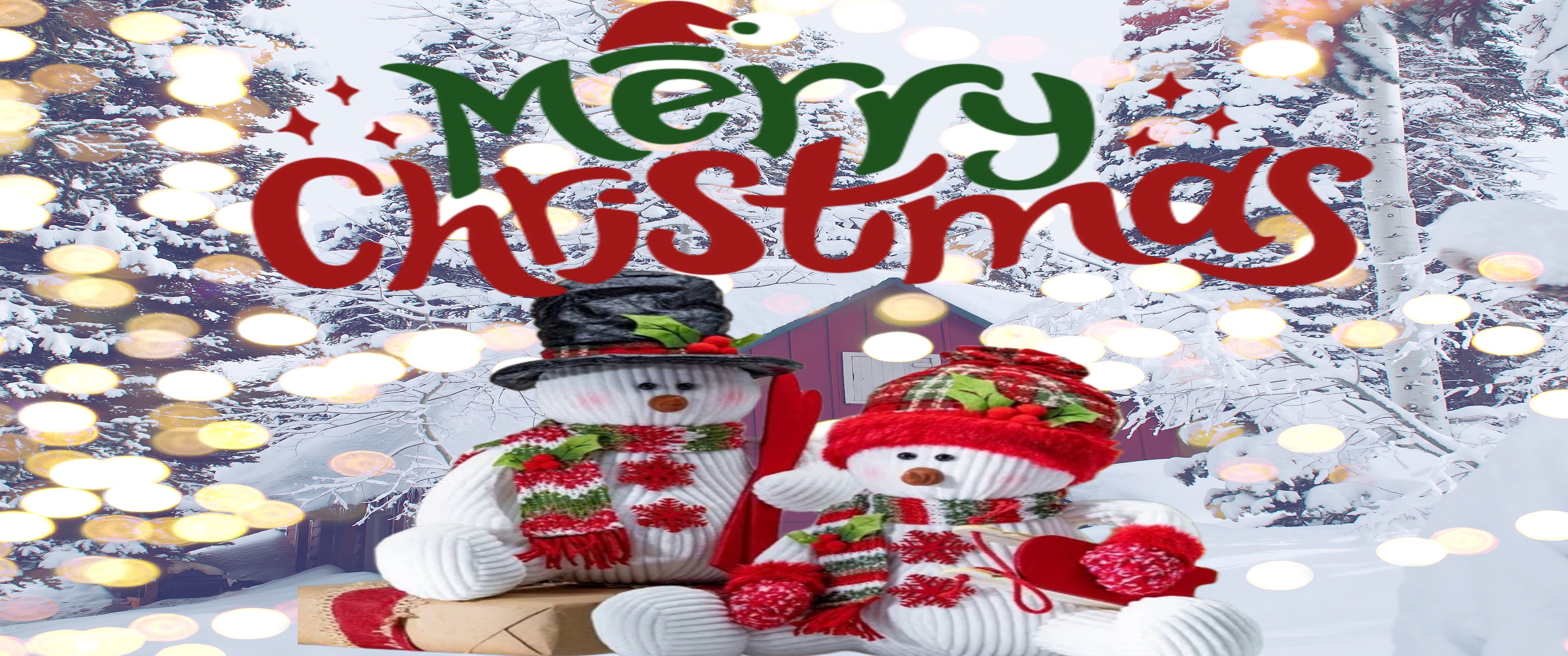 This festive HD wallpaper captures the heartwarming spirit of Christmas with two cheerful snowman dolls dressed in red and green winter attire. Seated in front of a rustic red cabin nestled among snow-covered trees, they evoke a sense of warmth and joy. Wrapped gifts and glowing light orbs enhance the magical holiday ambiance, while the playful “Merry Christmas” text at the top adds a whimsical touch. Perfect for bringing seasonal cheer to your screen, this image blends charm, color, and coziness in a delightful winter setting.
