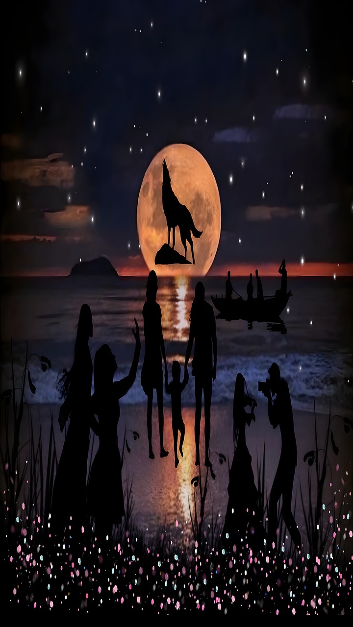 Moonlit Gathering with Howling Wolf and Ocean Reflections