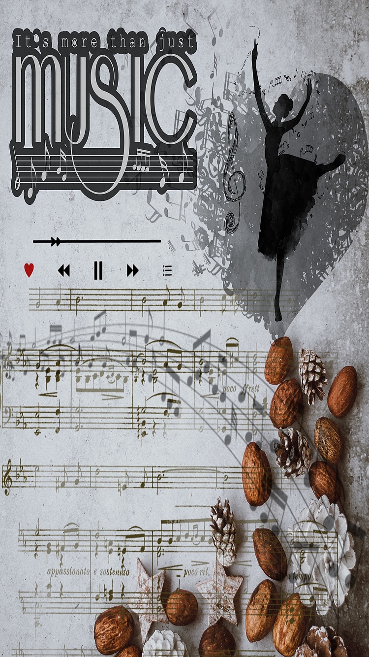 A subtle music player interface adds a modern touch, while the background showcases classical sheet music with Italian terms like “appassionato e sostenuto” and “poco rit.” Natural accents such as pinecones, nuts, and festive stars at the bottom evoke a seasonal warmth, making this wallpaper ideal for those who appreciate the fusion of nature, rhythm, and emotion. Perfect for mobile screens, especially iPhones, this vertical artwork offers both aesthetic beauty and thematic richness.