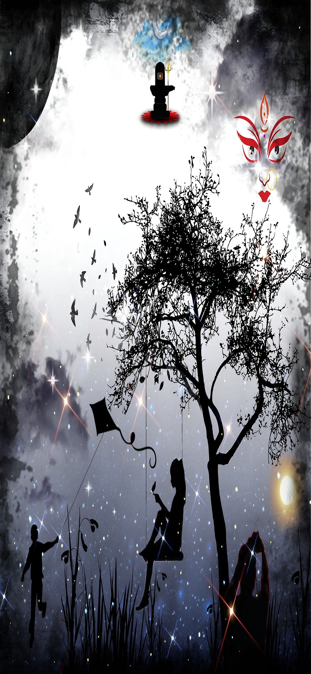 This wallpaper beautifully integrates spiritual symbolism with natural elements, making it a unique piece for those who appreciate cosmic and mystical themes. The Shiva Lingam and trident symbolize divine energy and protection, while the crescent moon and stars evoke a sense of calm and wonder. The red stylized face adds a cultural touch, suggesting themes of divine feminine energy or goddess worship. The silhouettes of children playing bring innocence and joy into this cosmic setting, blending earthly life with celestial spirituality. Such imagery appeals to fans of spiritual art, cosmic backgrounds, and fantasy night scenes, offering a high-resolution wallpaper that inspires reflection and imagination.