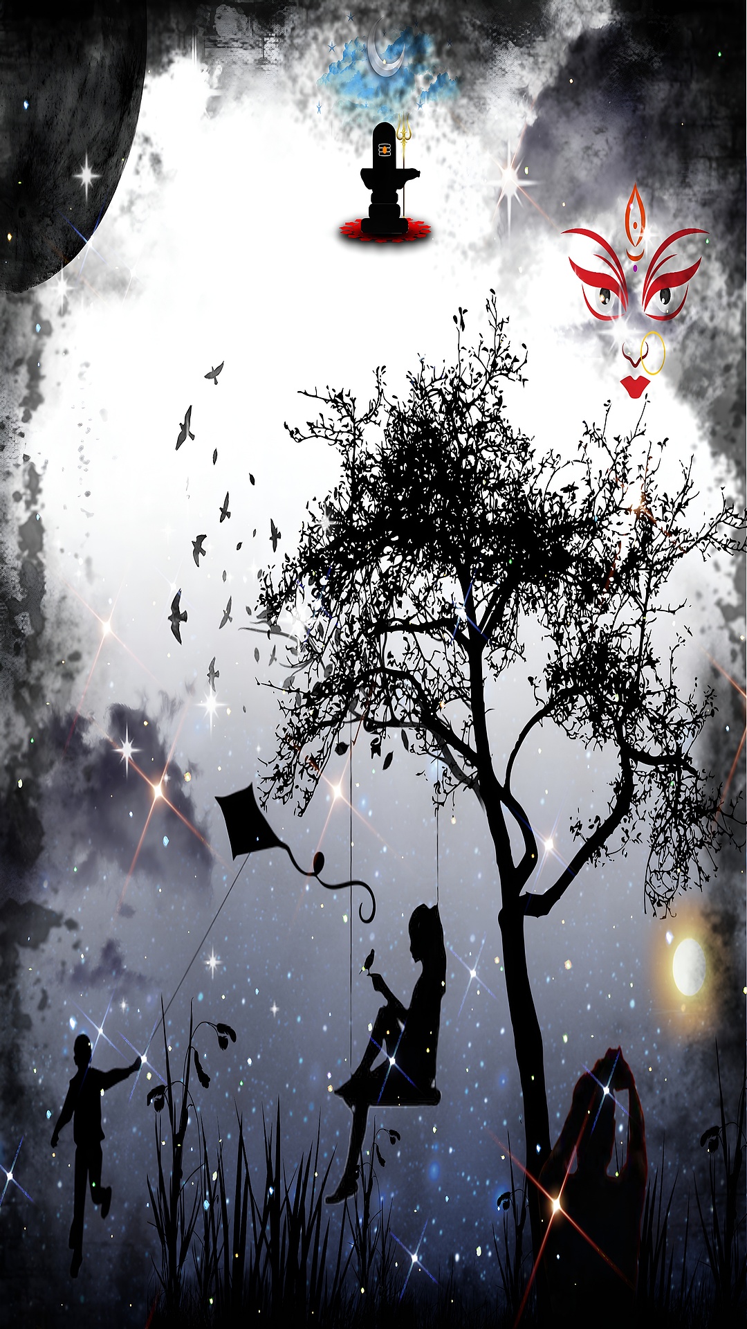 This Mystical Night Silhouette Art HD Wallpaper captures a dreamlike scene where spirituality meets childhood innocence under a cosmic sky. The main subjects are the striking black silhouettes of a large, leaf-sparse tree with a child sitting on a swing, holding a small bird, and another child running while flying a kite. These figures are set against a glowing, star-speckled night sky that blends soft whites and deep midnight blues, creating a magical atmosphere. The scene is further enriched by symbolic elements such as a crescent moon, a large dark celestial body, and a faintly visible spiritual icon resembling a Shiva Lingam with a trident, floating above the horizon. A stylized face with red accents appears subtly in the clouds, adding a layer of mysticism and cultural depth.