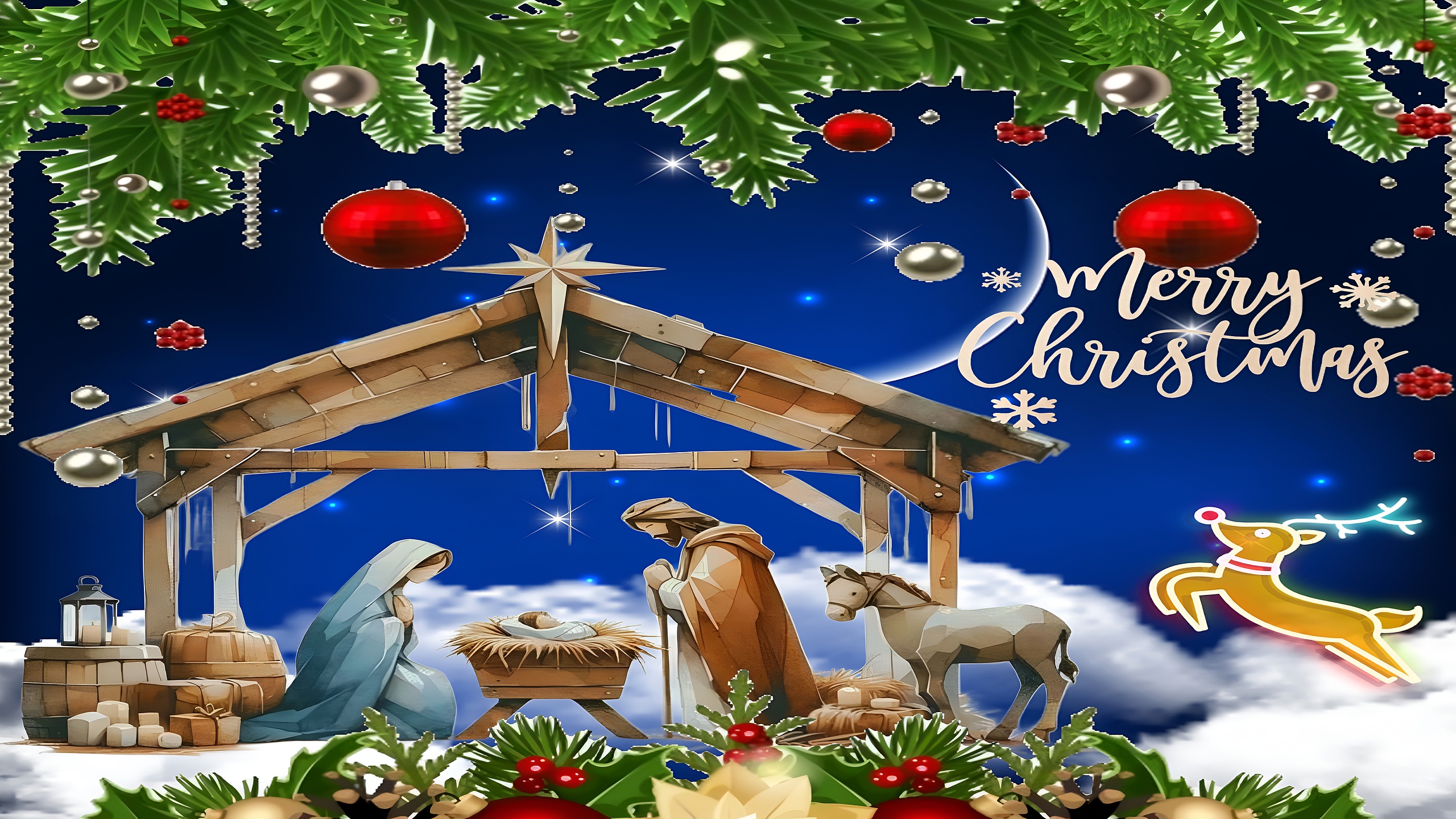 Nativity Christmas scene this HD wallpaper captures the essence of Christmas through a beautifully illustrated Nativity scene. At the center, baby Jesus rests in a manger under a wooden stable adorned with a glowing star. Mary and Joseph lovingly watch over Him, while a gentle donkey stands nearby. The serene night sky, filled with twinkling stars and a crescent moon, adds a peaceful backdrop. Festive elements like hanging red and silver ornaments, snow-dusted pine branches, and a flying reindeer with a glowing nose bring joyful holiday charm. The elegant “Merry Christmas” script and the cozy arrangement of pinecones, holly, and candles at the bottom complete the scene, making it perfect for those who cherish tradition and warmth during the holidays.