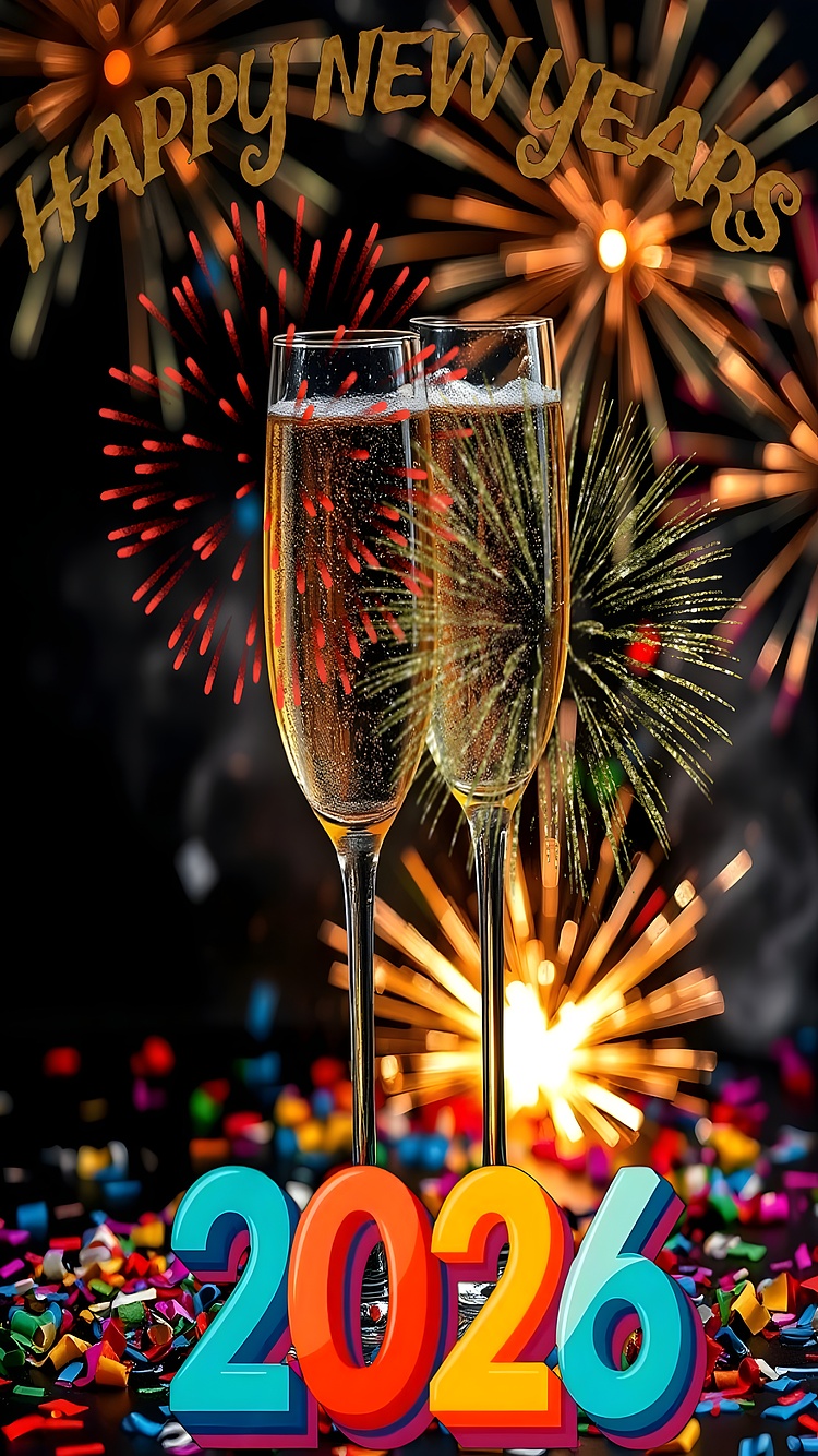 Celebrate the arrival of 2026 with this vibrant HD wallpaper featuring a joyful New Year’s Eve scene. At the heart of the image, two champagne glasses meet in a cheerful toast, filled with golden bubbles that sparkle against a backdrop of dazzling fireworks. The sky bursts with vivid reds, greens, and yellows, creating a dynamic and uplifting atmosphere. Scattered confetti in the foreground adds a playful touch, enhancing the festive mood.