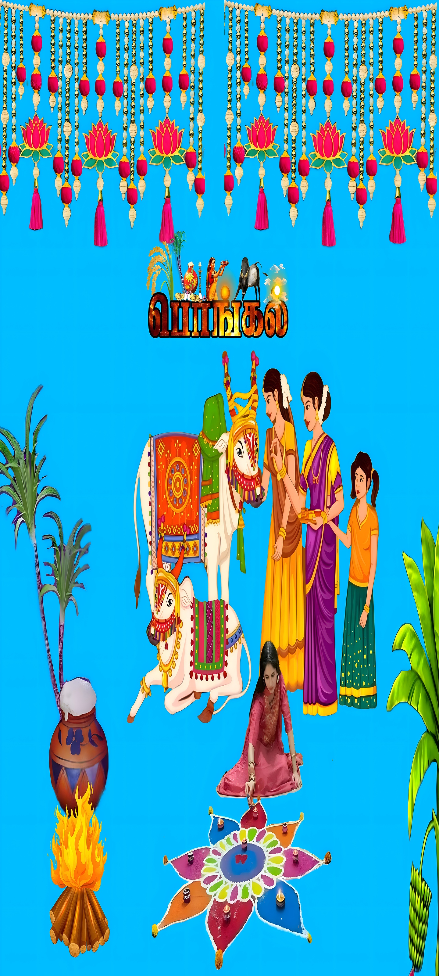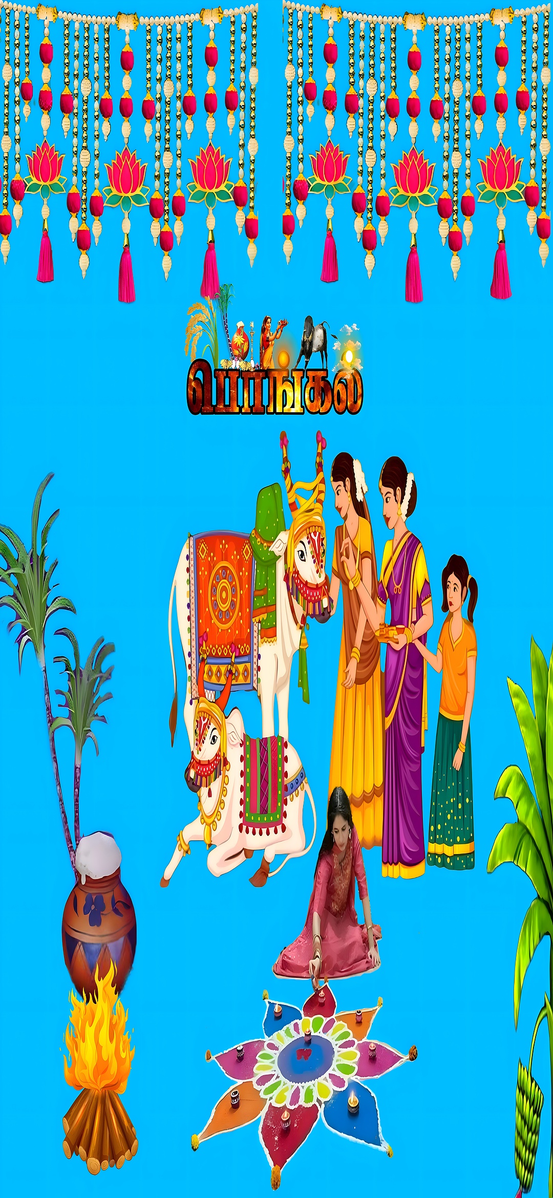 This Pongal Festival Celebration Art wallpaper beautifully captures the essence of the traditional South Indian harvest festival, Pongal, with a vivid and colorful artistic style. The main subjects include two elaborately decorated cows, a group of women dressed in traditional sarees and ethnic attire, and a young girl creating a vibrant rangoli pattern on the floor. The bright blue background sets a striking contrast, making the warm orange, pink, and green hues of the decorations and clothing stand out vividly. The image evokes a lively and joyous atmosphere, celebrating cultural heritage and the spirit of thanksgiving during the harvest season.