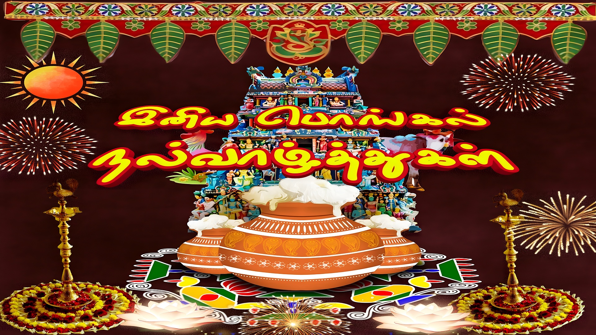 This high-resolution wallpaper showcases key elements of the Pongal festival, including the iconic clay pots with overflowing milk, which signify abundance and gratitude for a bountiful harvest. The colorful rangoli beneath the pots adds intricate patterns and bright colors like vibrant orange, golden yellow, and bright green, enhancing the festive feel. The temple gopuram in the background represents spiritual reverence and cultural heritage, while the traditional oil lamps and floral decorations symbolize light and purity. Fireworks and the radiant sun motif further emphasize the celebratory nature of this harvest festival, making this wallpaper a perfect choice for those seeking a desktop background or mobile wallpaper that reflects South Indian cultural festivities and harvest season themes.