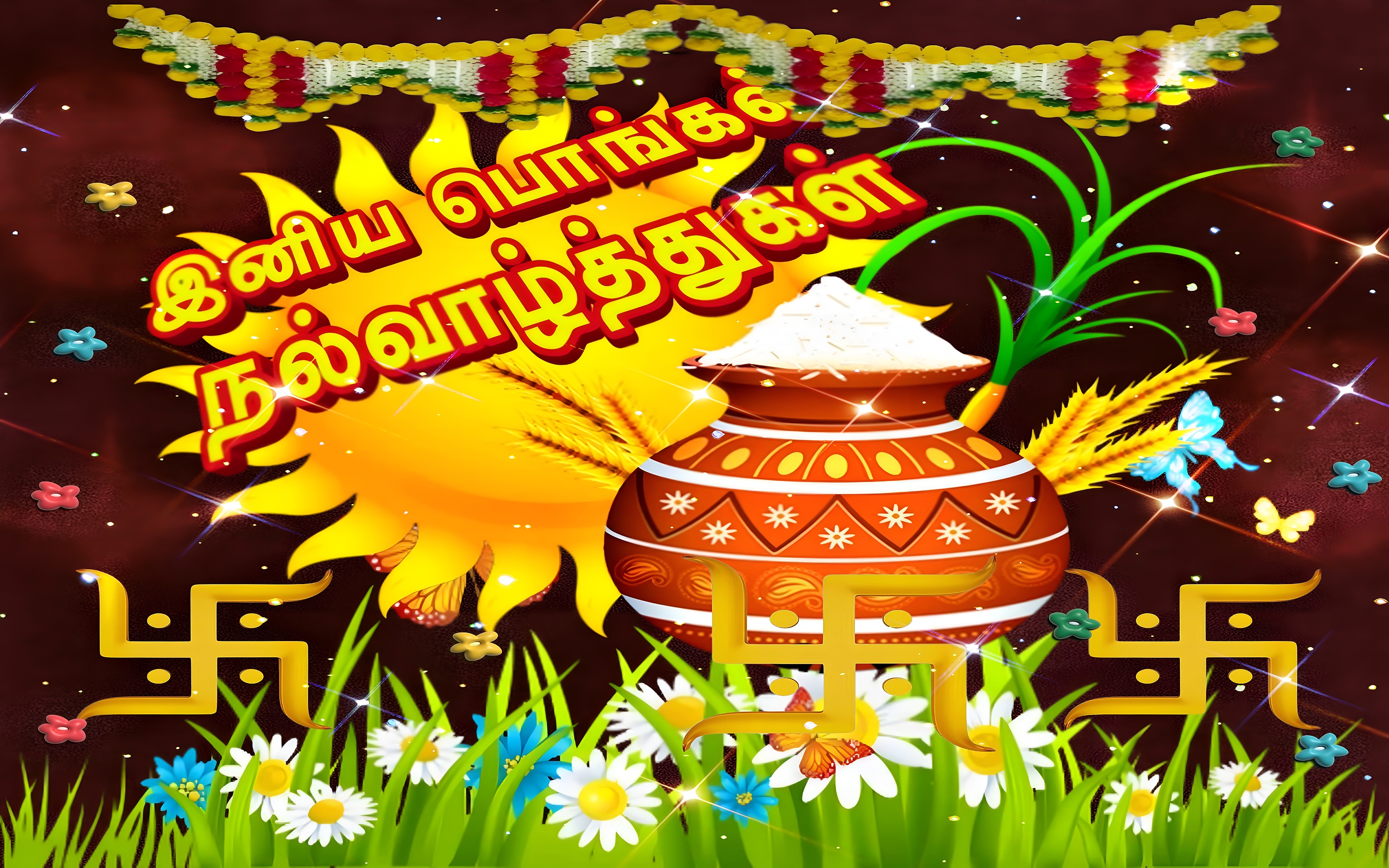 The wallpaper’s rich palette of bright yellow, deep brown, vibrant green, and crisp white accents brings warmth and energy to any screen. Sparkling light effects and small butterflies add a magical touch to the design, enhancing its decorative appeal. This high-resolution wallpaper is perfect for those who want to celebrate Pongal with a visually stunning and culturally meaningful desktop or mobile background.