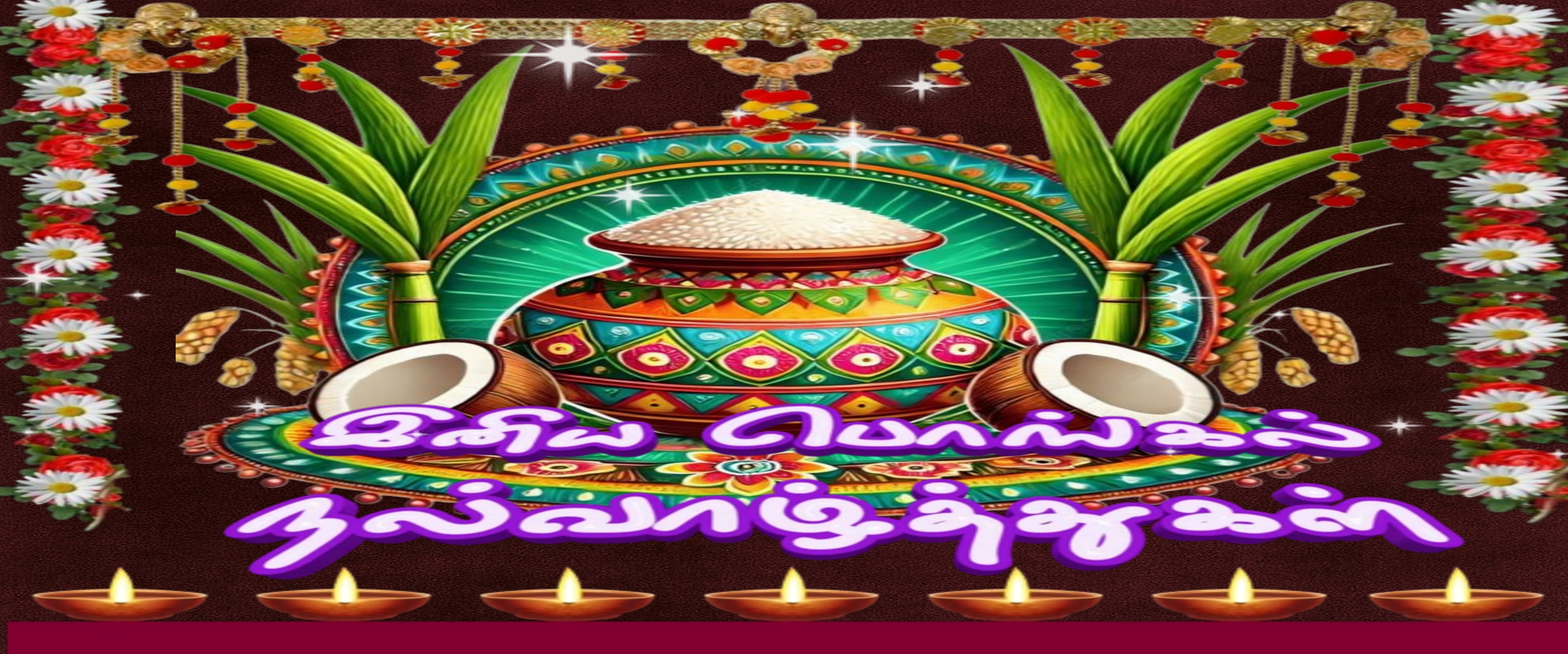 The background features a deep maroon textured surface that contrasts elegantly with the bright colors of the pot and natural elements, while sparkling highlights add a magical glow to the scene. Below the pot, a row of lit diya lamps casts a warm golden light, symbolizing hope and positivity. This high-resolution wallpaper, with its 3464×3464 resolution, is perfect for anyone wanting to bring the spirit of Pongal into their digital space, whether on desktop, laptop, or mobile devices.