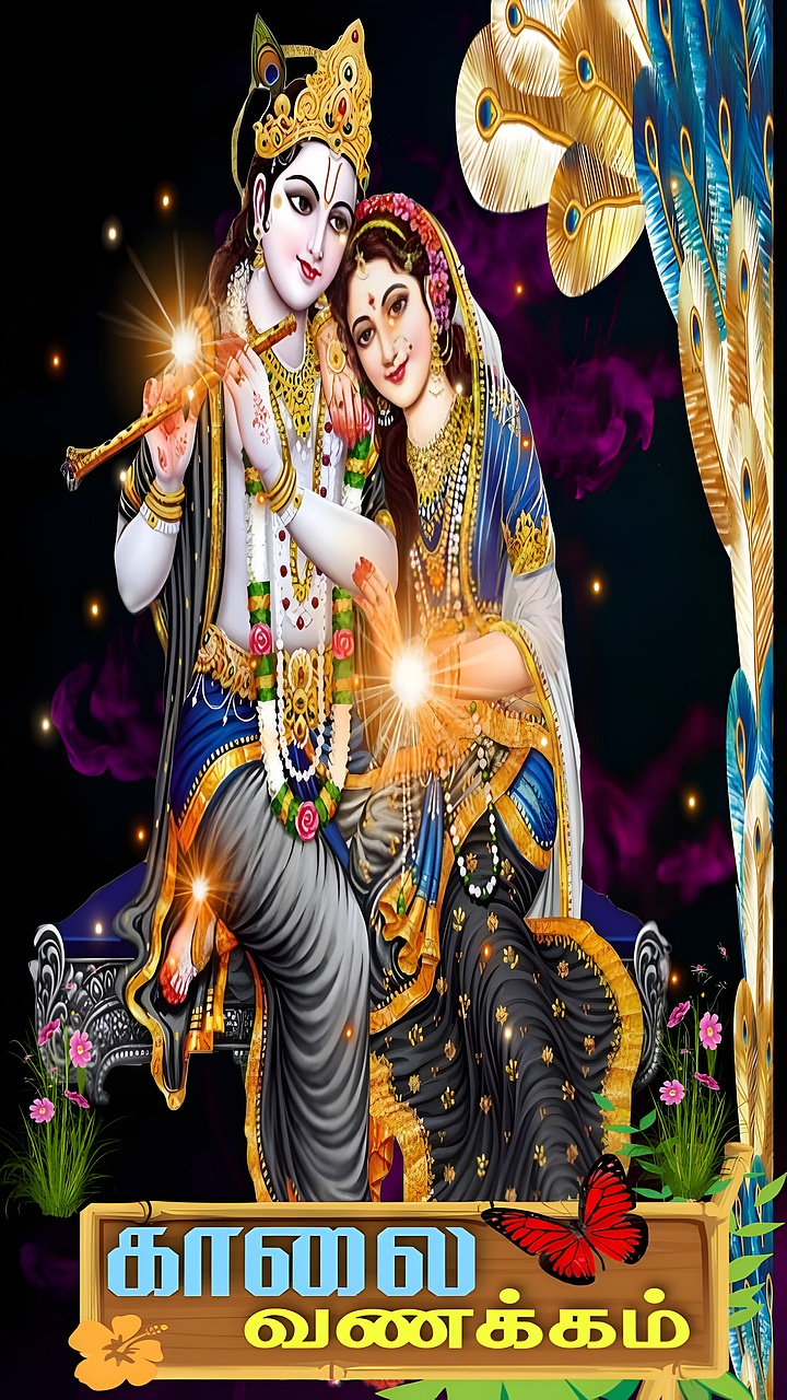 Set against a deep black background, the wallpaper emphasizes the radiant figures of Radha and Krishna, surrounded by glowing orbs and subtle purple smoke that enhance the spiritual atmosphere. The presence of peacock feathers on the right side adds symbolic beauty, representing Krishna’s divine connection to nature and grace. The warm golden yellow and royal blue hues dominate the palette, complemented by vibrant red accents such as the butterfly resting on the wooden plaque below, which features Tamil script. This premium HD wallpaper invites viewers to immerse themselves in a serene and devotional mood, perfect for spiritual reflection or decorative wall art.
