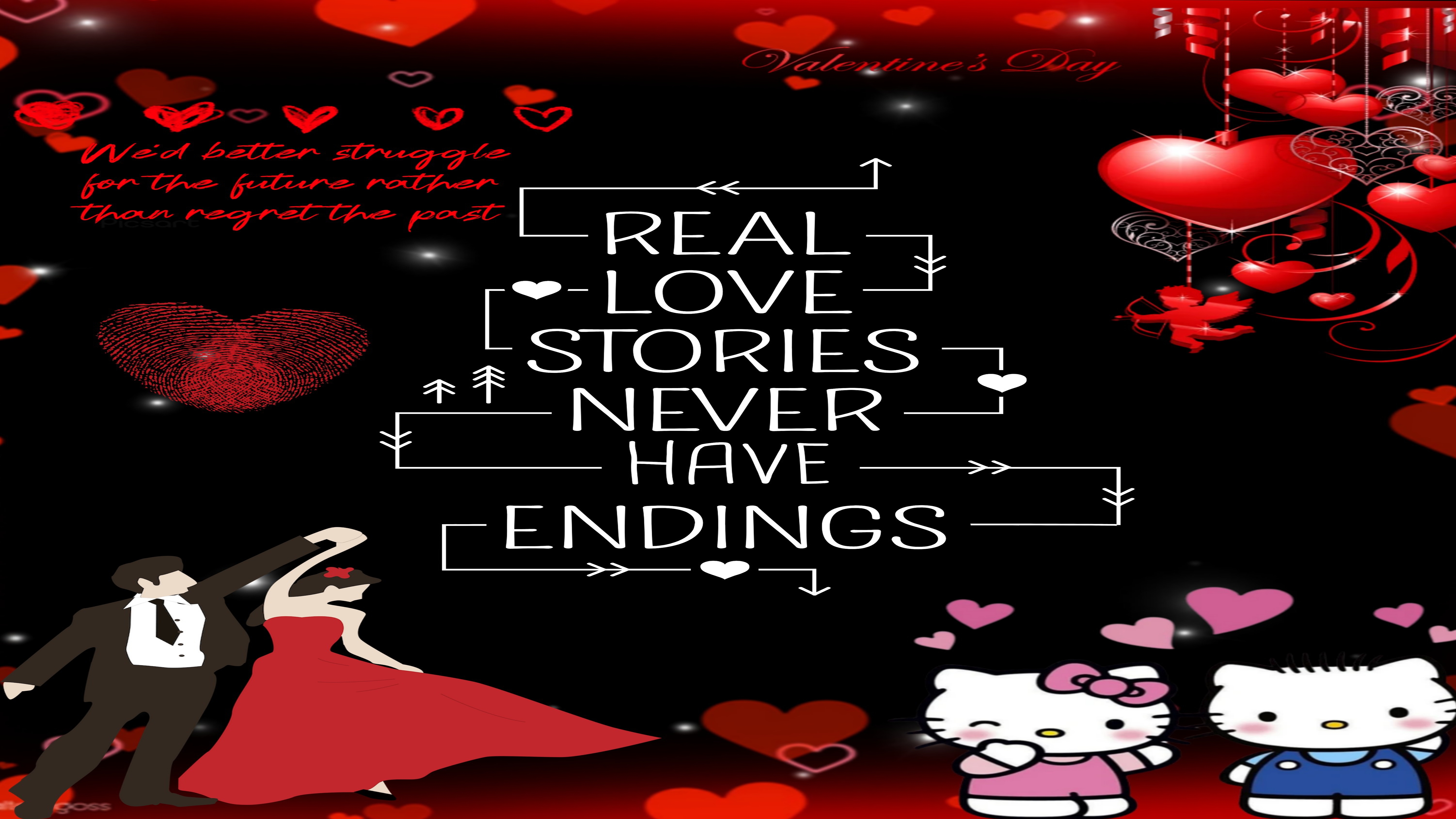 This Real Love Stories Valentine Wallpaper beautifully captures the essence of love and romance through a striking digital composition. The main subject is a heartfelt quote, "Real Love Stories Never Have Endings," prominently displayed in white stylized typography against a deep black background. Surrounding the text are various romantic elements, including a dancing couple dressed elegantly—the woman in a flowing red gown and the man in a classic black tuxedo—evoking a timeless love story. The image also features two adorable cartoon characters reminiscent of Hello Kitty, adding a playful and tender touch to the overall design.