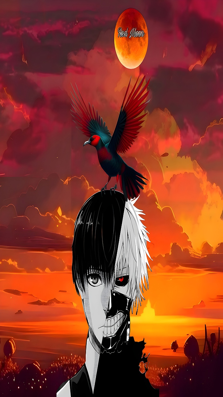 This captivating HD wallpaper titled Red Moon Anime Character Art features a striking split-face anime character set against a breathtaking fiery orange and deep red sunset sky. The image masterfully blends monochrome elements with vibrant colors, showcasing the character's black and white hair and a half-mask revealing a sinister skeletal grin on one side. Perched atop the character's head is a mystical bird with vivid red and black feathers, adding a dramatic and surreal touch to the composition. The glowing red moon in the background, inscribed with the words "Red Moon," enhances the dark fantasy atmosphere, creating a perfect balance between mystery and intensity.