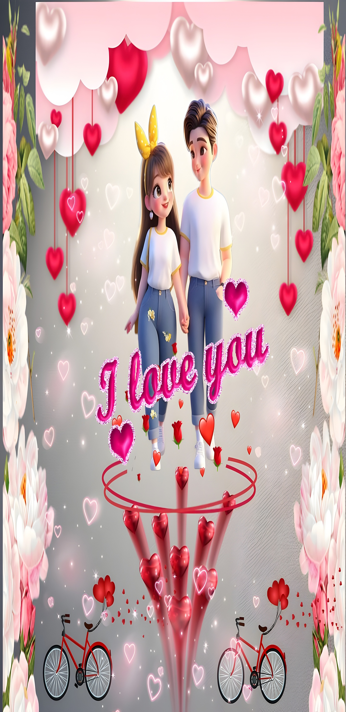 The wallpaper’s artistic style is a blend of 3D cartoon animation and digital art, with smooth textures and vibrant colors that bring the scene to life. The background is a subtle gradient of soft pink and white, framed by lush floral elements on both sides, featuring white and pink flowers with green leaves. This creates a delicate and dreamy ambiance, perfect for expressing love and affection. The floating hearts and red bicycles with heart-shaped balloons add whimsical charm, making this wallpaper an ideal choice for romantic desktop or mobile backgrounds.