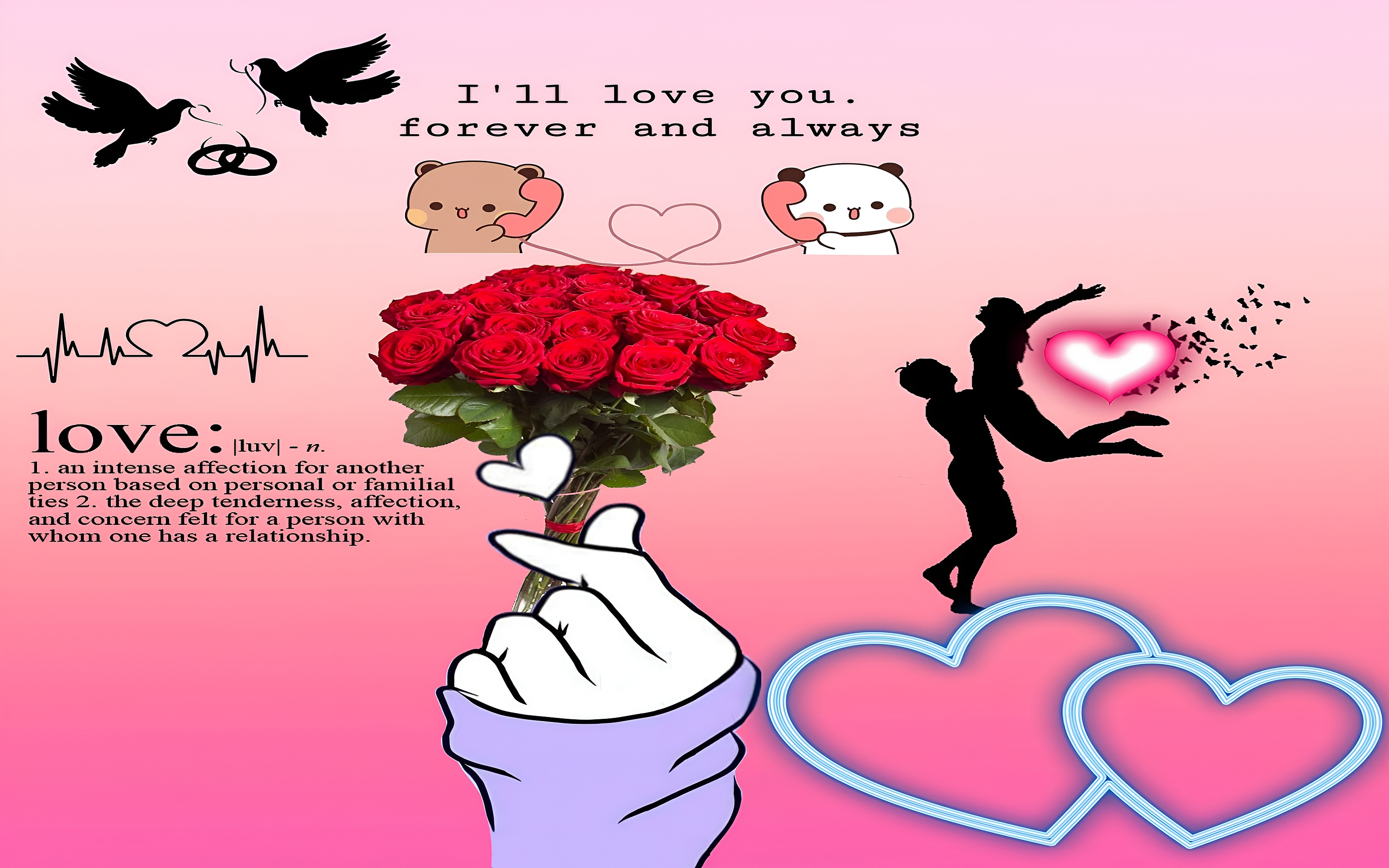 This wallpaper features a rich palette of red, pink, black, and light purple tones that evoke feelings of passion, warmth, and intimacy. The red roses symbolize love and romance, while the pink gradient background adds softness and a dreamy quality. The black silhouettes of the couple and doves bring a timeless elegance and contrast that draws the eye. The inclusion of the heartbeat line with a heart shape and the detailed definition of "love" adds depth and meaning, making this wallpaper not just visually attractive but emotionally resonant. The cartoon bears on the phone emphasize connection and communication in relationships, enhancing the theme of enduring love.