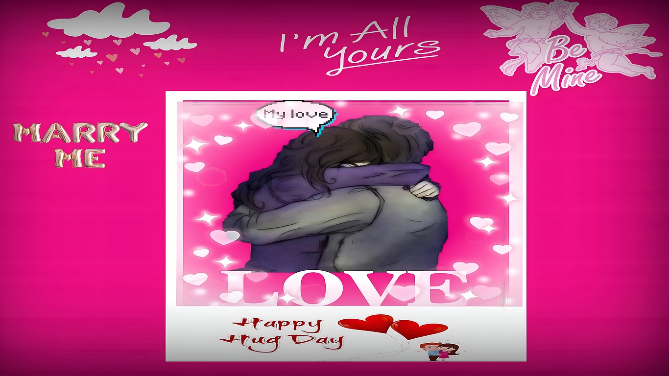 This Romantic Love Hug Day Wallpaper captures an intimate moment between two people wrapped in a warm embrace, symbolizing affection and deep emotional connection. Set against a vibrant pink background filled with soft glowing hearts and sparkles, the image radiates love and tenderness. The central illustration features a couple hugging closely, their figures softly shaded in muted grays and purples, creating a gentle contrast with the vivid backdrop. This high-resolution wallpaper perfectly conveys the warmth and comfort of a loving hug, making it an ideal choice for expressing romantic feelings on special occasions like Hug Day or Valentine's Day.