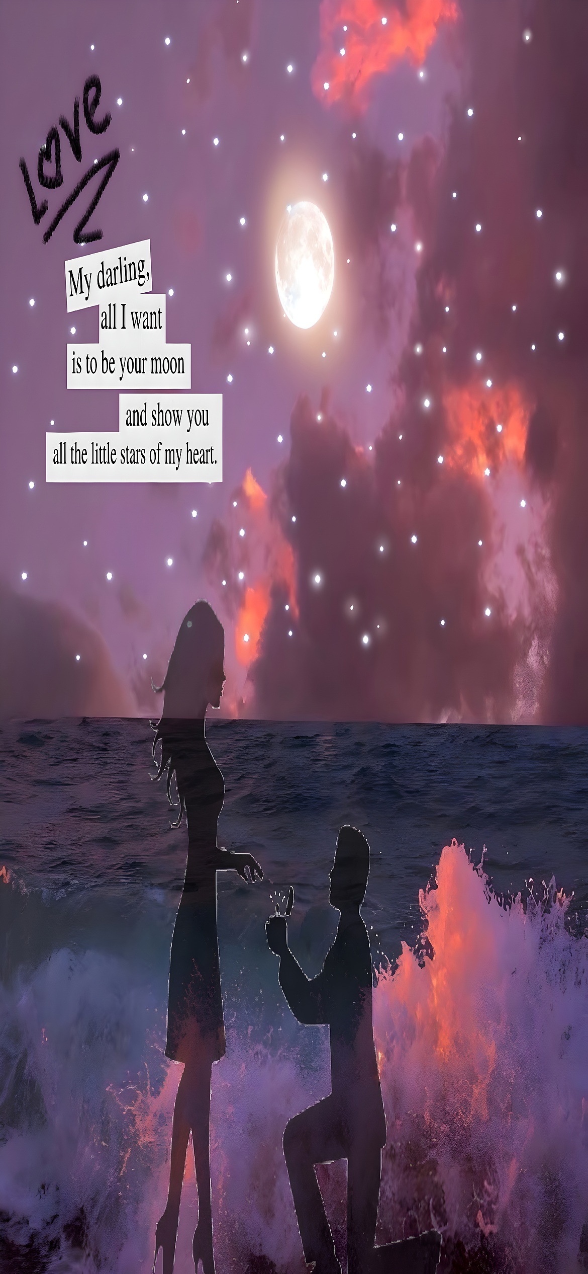 The wallpaper’s dominant colors—deep purple, soft pink, midnight blue, and warm orange—create a captivating visual story of love under the stars. The textured ocean waves and glowing moonlight set a serene yet passionate tone, while the silhouetted couple adds a timeless romantic element. This romantic night wallpaper is a perfect example of how high-definition backgrounds can evoke strong emotions and enhance any digital space. The interplay of light and shadow, combined with the poetic setting, makes this image a standout choice for anyone looking to decorate their screen with love-inspired art.