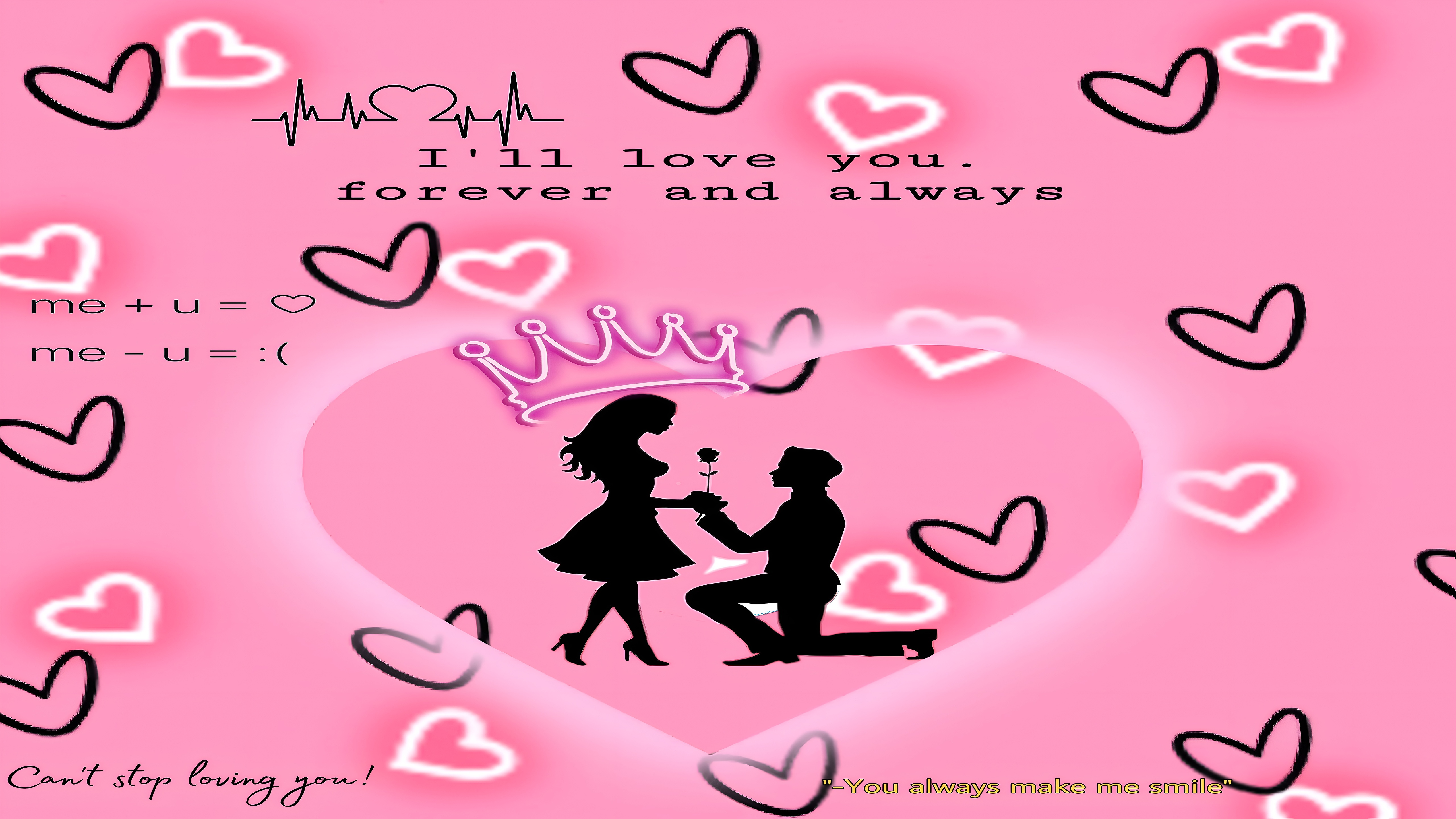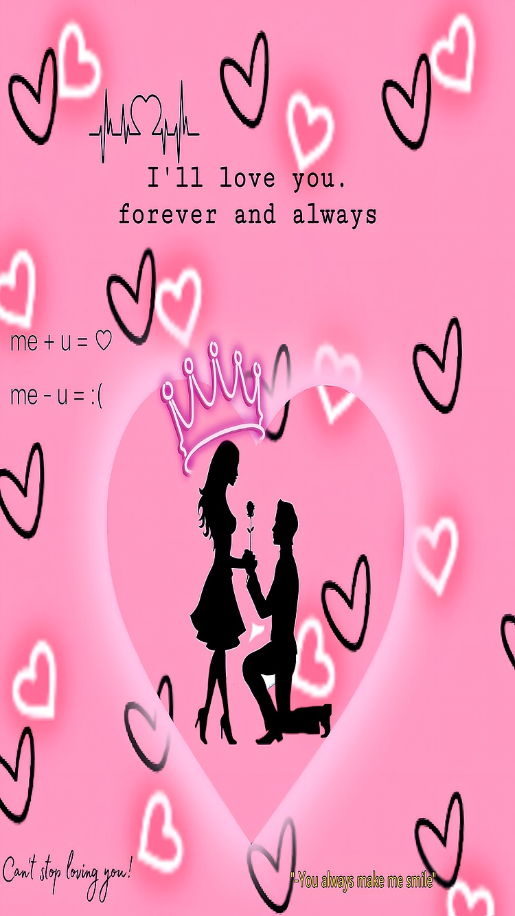 The wallpaper's artistic style blends minimalistic silhouette art with neon-inspired decorative elements, such as the glowing pink crown above the woman's head, emphasizing her as the queen of the moment. The heartbeat line with a heart shape integrated into it adds a symbolic touch of love's pulse, enhancing the emotional depth of the design. This romantic theme is further enriched by heartfelt text phrases scattered across the image, reinforcing the message of eternal love and devotion.